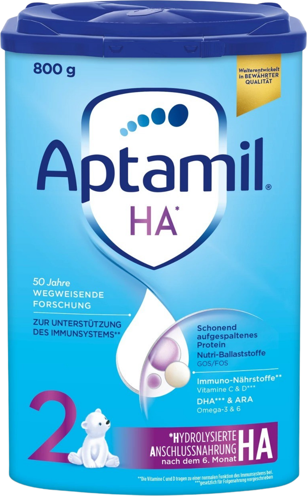 Aptamil HA 2 är en tillskottsnäring som passar för barn från och med 7 månaders ålder. Produkten innehåller, utöver en åldersanpassad sammansättning av vitaminer och näringsämnen, även skonsamt hydrolyserat protein, Bifidus Breve-bakterier, omega-3 (DHA) och omega-6 (ARA) fettsyror samt en särskild kombination av kostfibrer.