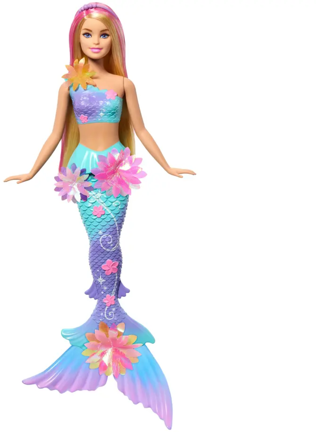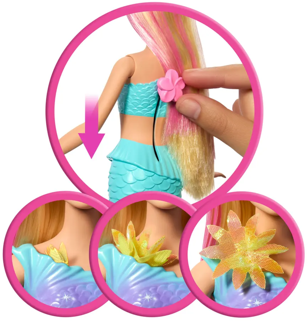 Dyk ner i en värld av gnistra, färg och magi med sjöjungfrudockan Barbie Flower Magic! Med bara en handledsrörelse börjar blommorna på hennes överdel och svans blomma. Oavsett om hon leker i vattnet eller på land gör de bländande blommorna och det pärlbesatta pannbandet denna Barbie-docka till en riktig höjdpunkt i alla barnrum.