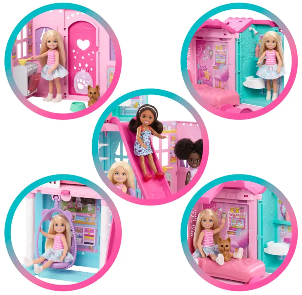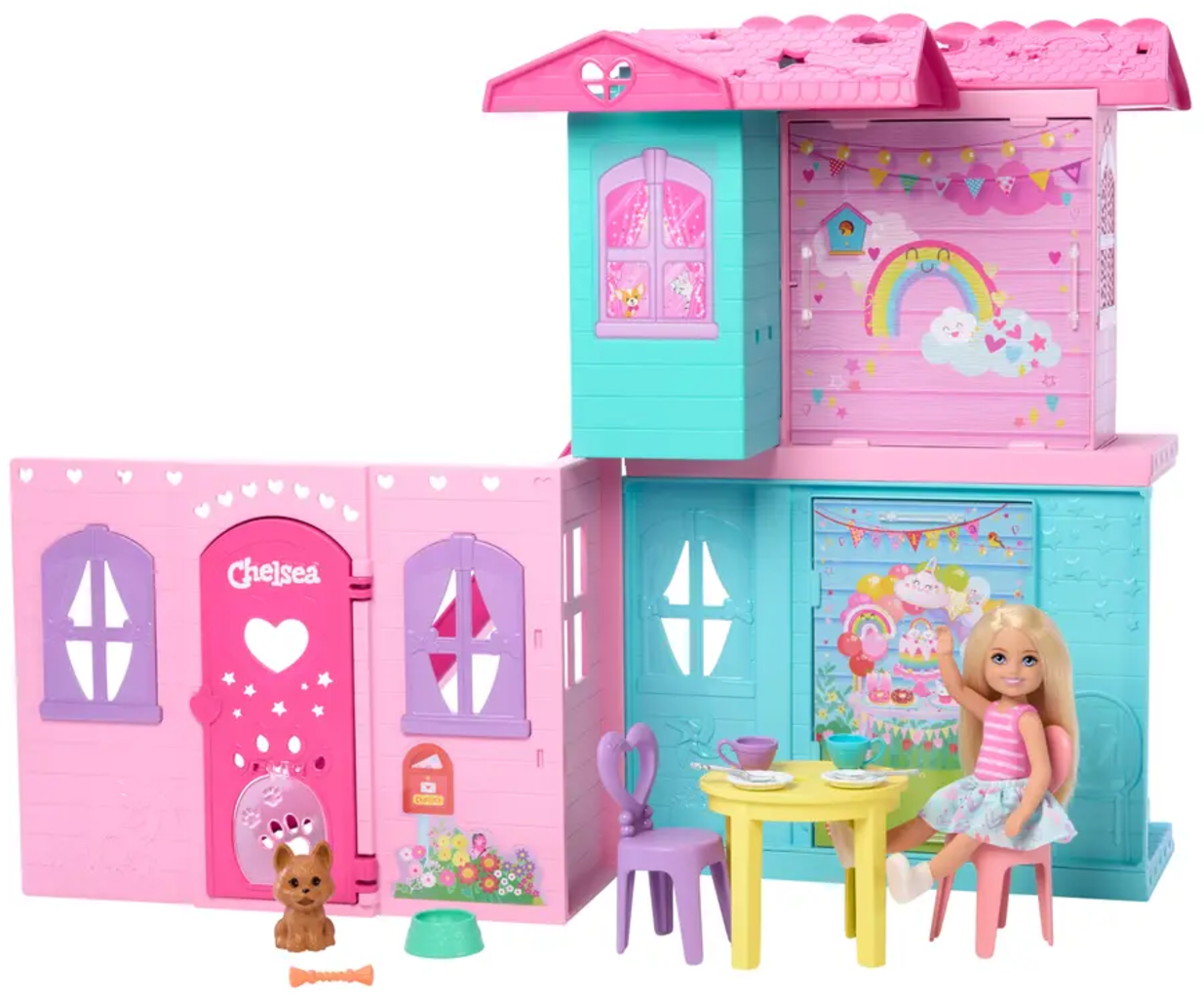 Med Chelsea Pop-Up Dollhouse blir leken ett stort äventyr! Det lilla huset förvandlas till ett enormt dockhus med mer än fem lekytor. Oavsett om ni lagar mat i köket, kopplar av i vardagsrummet, sover i sovrummet eller leker i badrummet – Chelsea och hennes hund har jättekul.