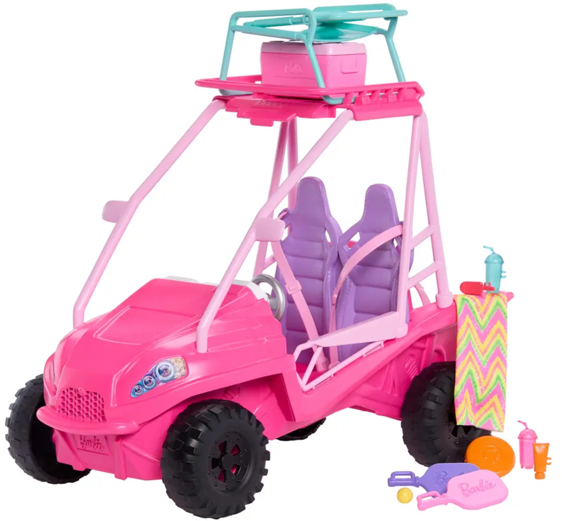 Ge dig ut på oändliga strandäventyr med Barbie och hennes vänner! Den ultimata strandvagnen är perfekt för fantasifull lek och ger ditt barn massor av strandkul direkt in i sitt rum. Med sin knallrosa färg, sportiga utseende och praktiska takräcke är den redo för alla stranduppdrag. Lasta upp till 4 dockor (säljs separat) och följ med dem på upptäcktsfärd i solen, sanden och det roliga!