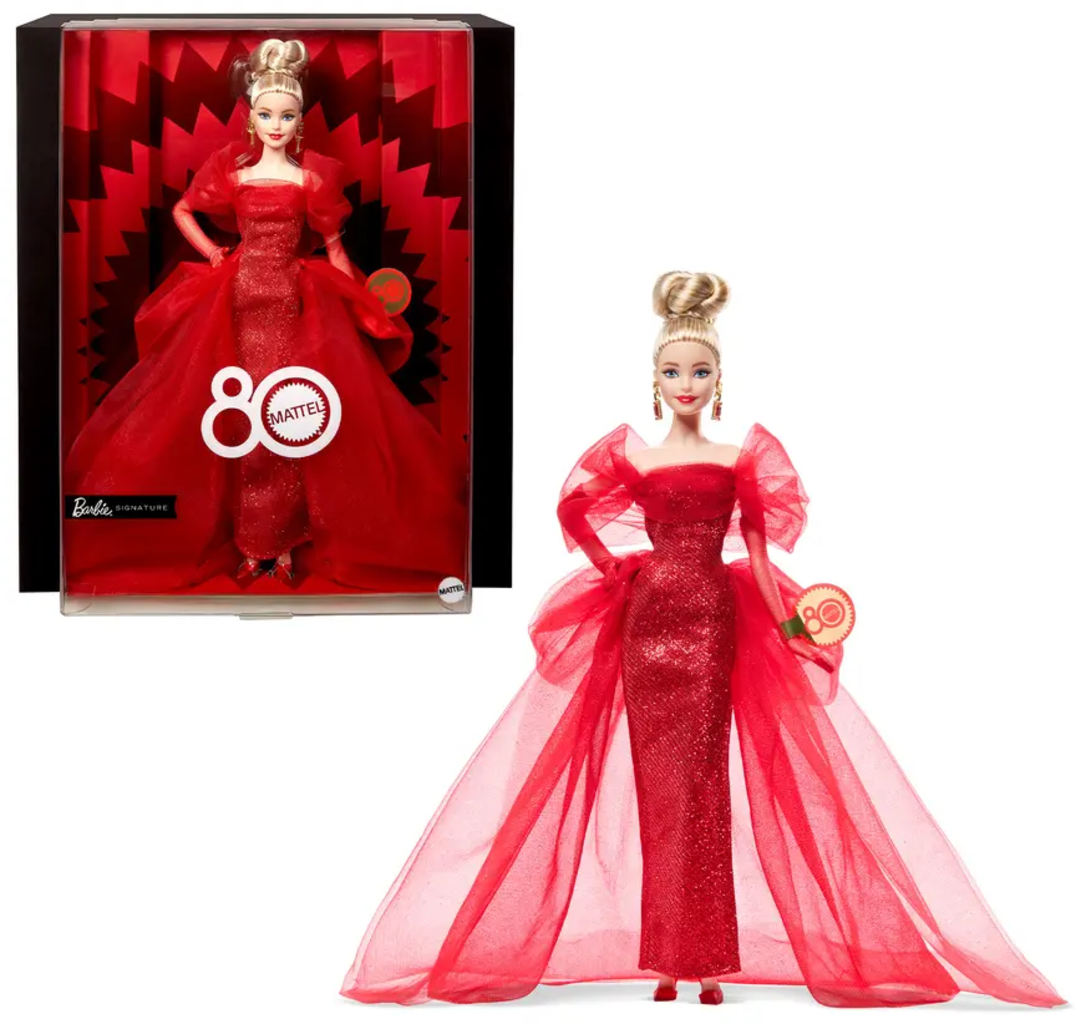 Barbie Signature Collectible Dock firar 80 år av Mattel i glamorös stil. Hon bär en glittrande röd tyllklänning med rosettärmar och ett tyllsläp, rubinröda pumps och droppformade örhängen med ett guldfärgat "M". Uppsatt blont hår och svarta naglar kompletterar outfiten. Dockställ ingår; dockan kan inte stå ensam.