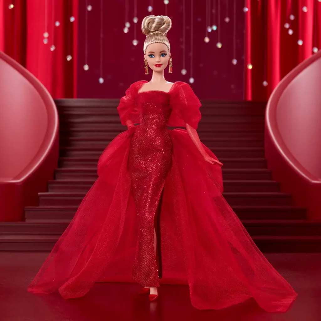 Barbie Signatur samlardocka för Mattels 80-årsjubileum, glittrig röd tyllklänning, blont hår