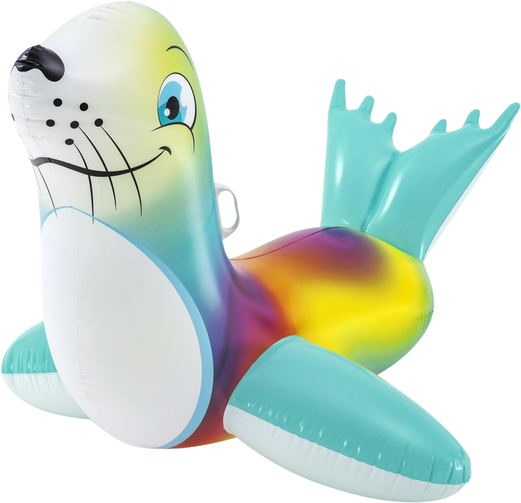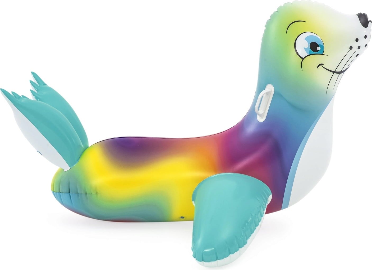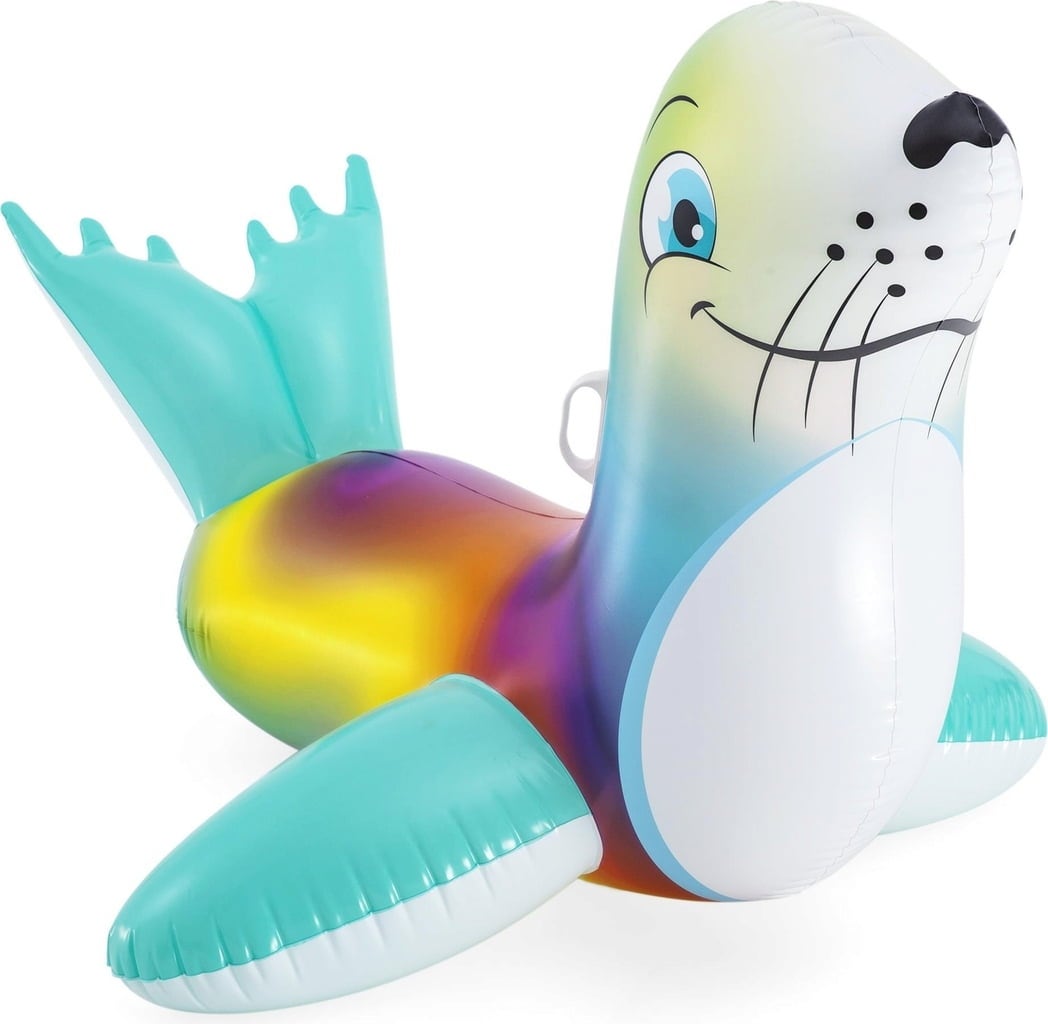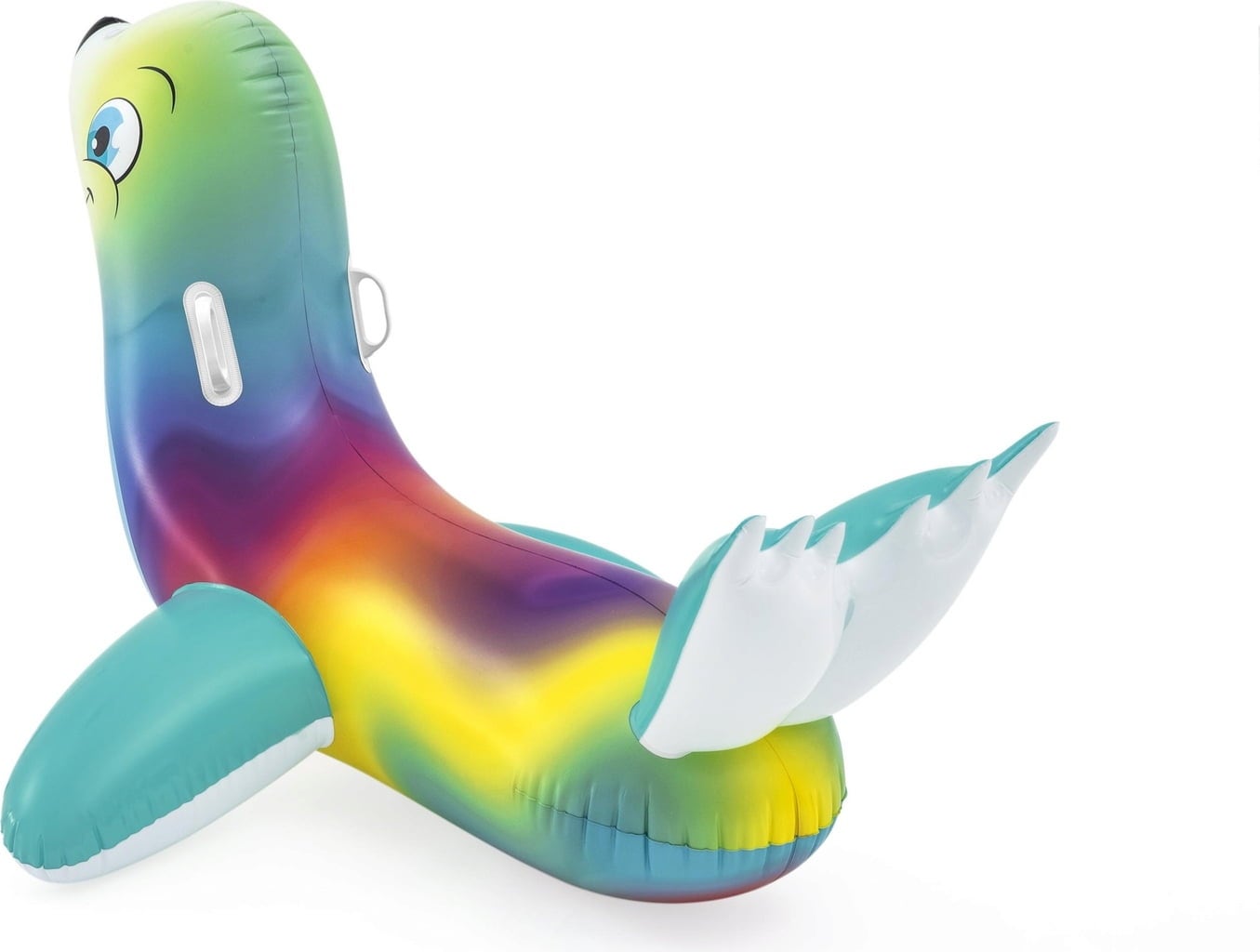 Upptäck denna supercoola sim-säl med sitt unika tie-dye-mönster! Denna gulliga havskompis ger både färg och massor av skoj i poolen. De robusta handtagen gör det enkelt att hålla balansen och klättra upp. Den uppblåsbara stjärtfenan och sidoflänsarna hjälper till med extra stabilitet.