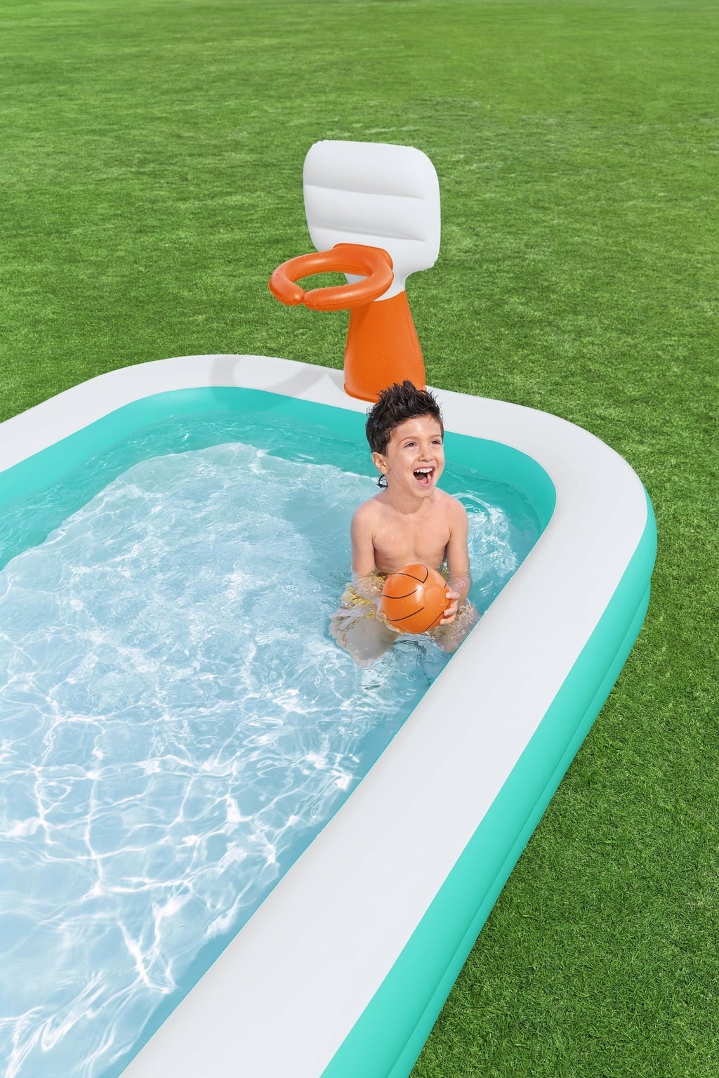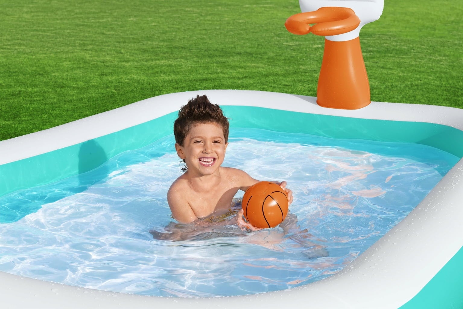 Vad sägs om att förvandla trädgården till en vattenarena där action och svalka går hand i hand? Med de inbyggda, uppblåsbara basketkorgarna blir denna pool den perfekta platsen för sportiga utmaningar!