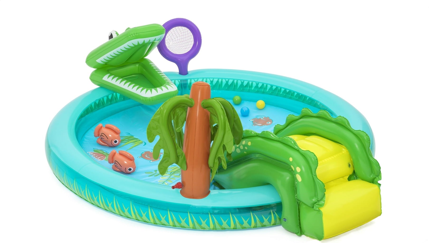 Med Bestway vattenspelcenter Krokodil tar du med dig djungeln hem! Tillverkat i slitstarkt PVC klarar det även de vildaste krokodilläkarna. Med en vattenkapacitet på 210 liter finns det gott om plats för bus och plask. Ett jättelikt krokodilhuvud vaktar leken och uppmuntrar till fantasifull lek, medan ett uppblåsbart träd fungerar som vattenspridare för extra svalka.