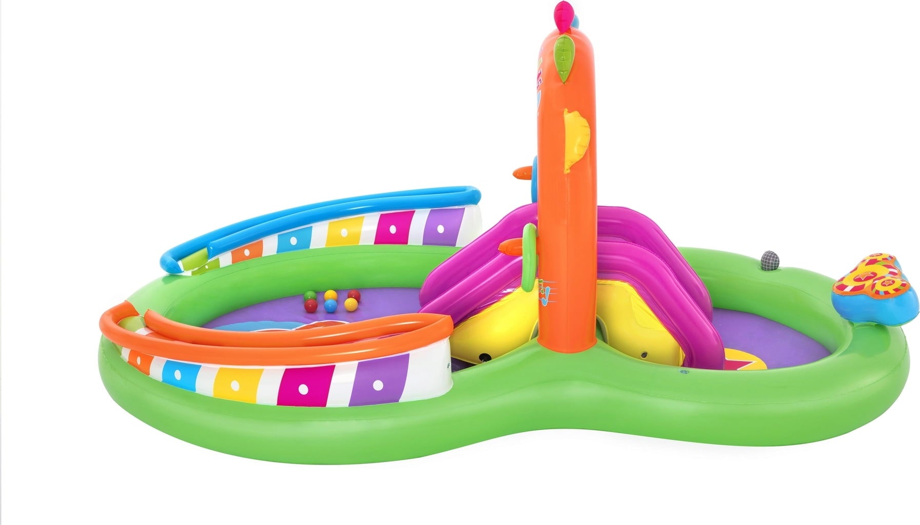 Spelcentret består av två poolområden som förbinds av en avtagbar rutschkana. Den vadderade uppblåsbara landningsytan framför rutschkanan ger extra komfort och säkerhet. Ett extra inslag är bågen med inbyggd vattenspridare, som håller både barnen och rutschkanan blöta – för ännu mer lekglädje. De som föredrar torra aktiviteter kan prova ringkastning eller rulla bollar genom banorna utanför poolen – perfekt för att träna koordination och fingerfärdighet!