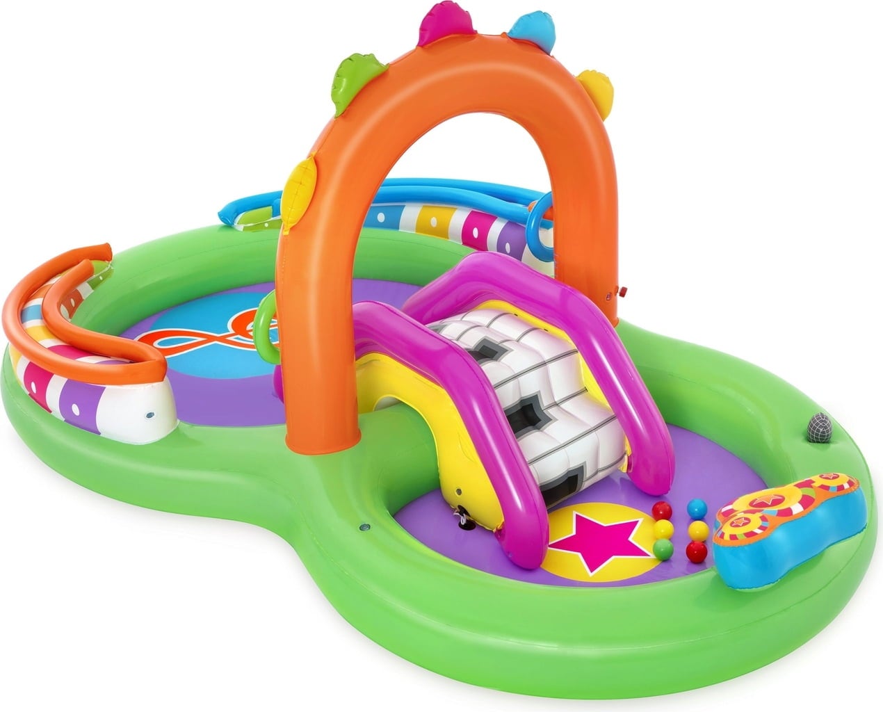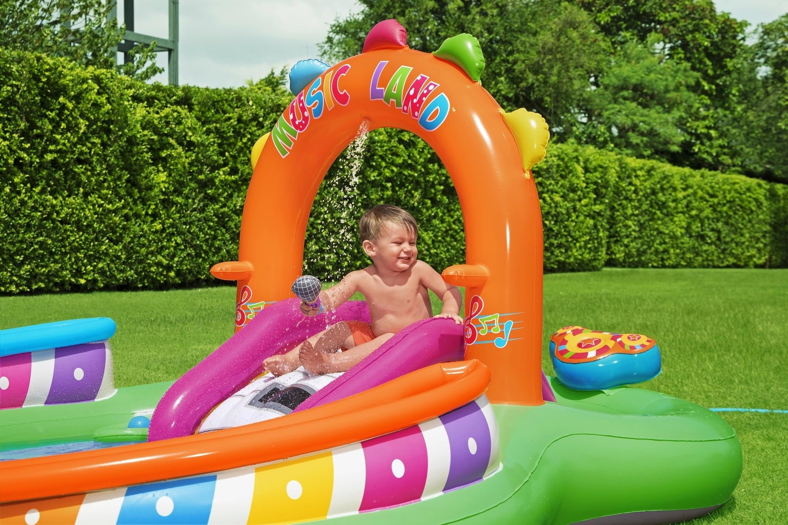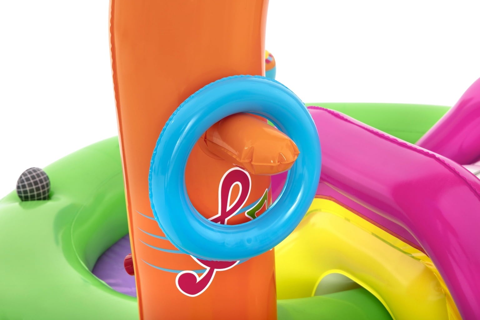 Bestway vattenspelcenter Sing 'n Splash förvandlas till en scen för små rockstjärnor och vattenälskare! Det är inte bara ett lekparadis utan även den perfekta platsen för svalka! Med uppblåsbara musikinstrument som mikrofon och trumma kan barnen utforska sin musikaliska sida medan de leker i vattnet.