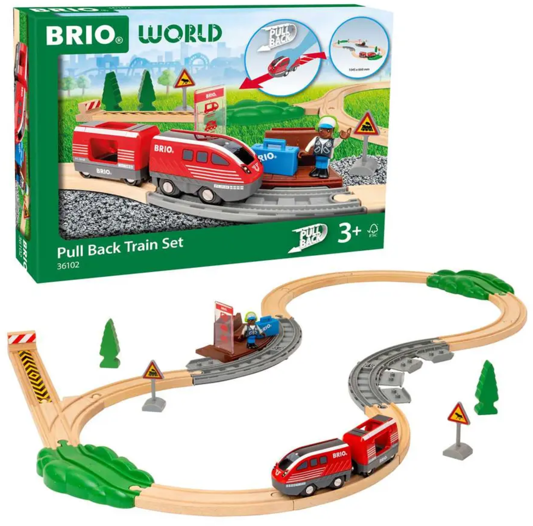 Här blir det fart på leken! Loket med dragmotor ger oändliga tågresor helt utan batterier, dra bara bakåt och släpp iväg det. Med perrong, träd och räls skapas en levande liten tågvärld som inbjuder till kreativ lek.