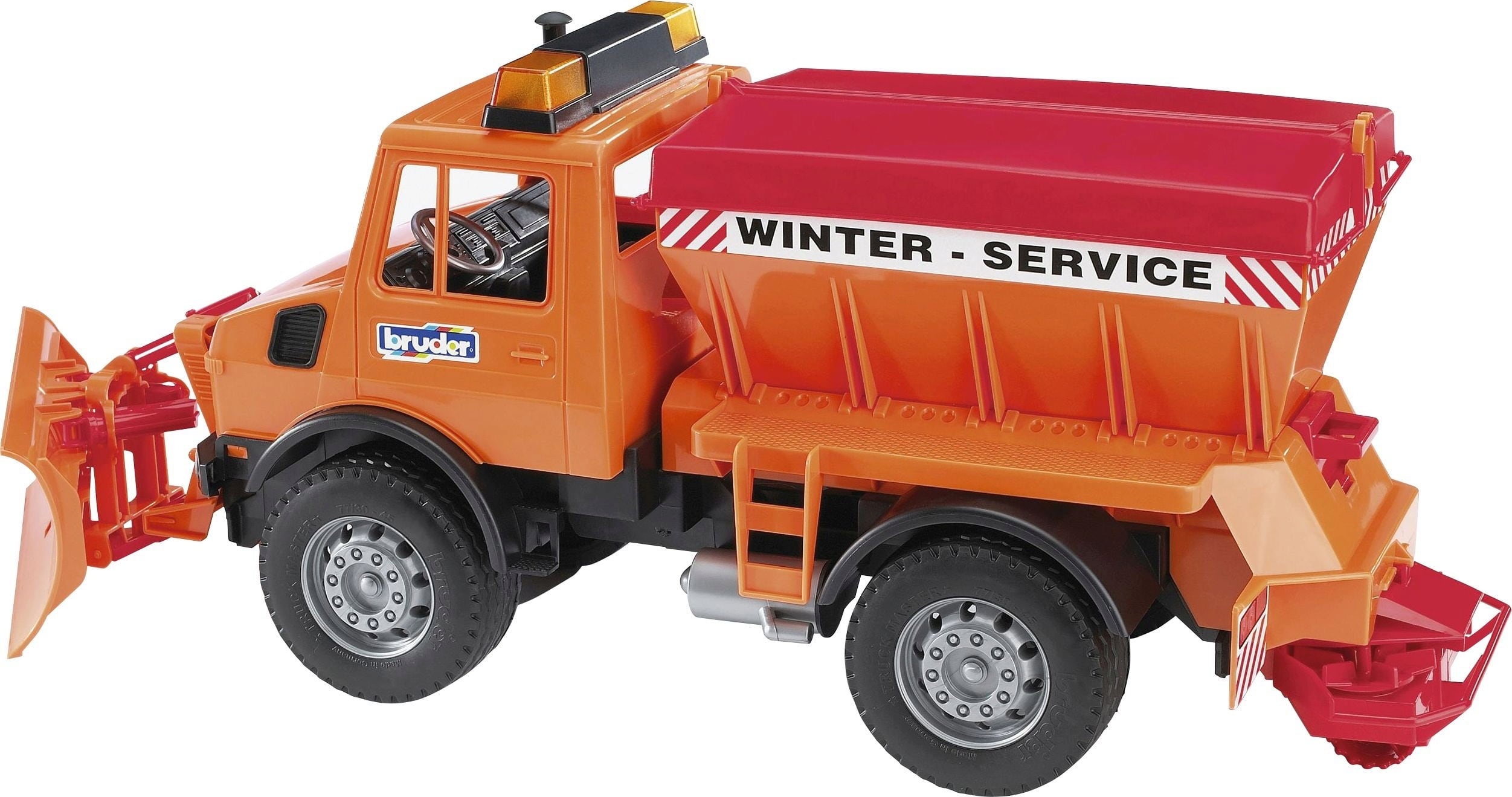 Med Unimog Vinterfordon kan röjning av snötäckta vägar simuleras realistiskt. Snöplogsbladet framtill kan flyttas och låsas på plats. Den stora silobehållaren baktill fylls via ett lock. Spridningsmaterialet fördelas sedan av den fullt fungerande spridaren.