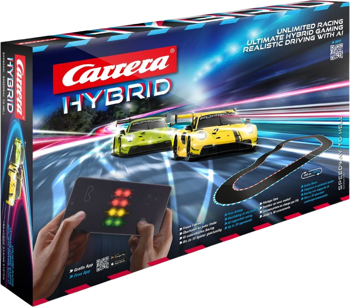 Startpaketet HYBRID - Speedway to Hell ger dig fartfylld underhållning både på och utanför banan. I kombination med den kostnadsfria HYBRID-appen kan du använda din smartphone eller surfplatta för att styra de två Porsche 911 GT3 Rs. Olika körlägen och individuella fordonsinställningar är tillgängliga för dig. 15 olika bansektioner möjliggör många olika banlayouter så att du alltid kan möta nya utmaningar.