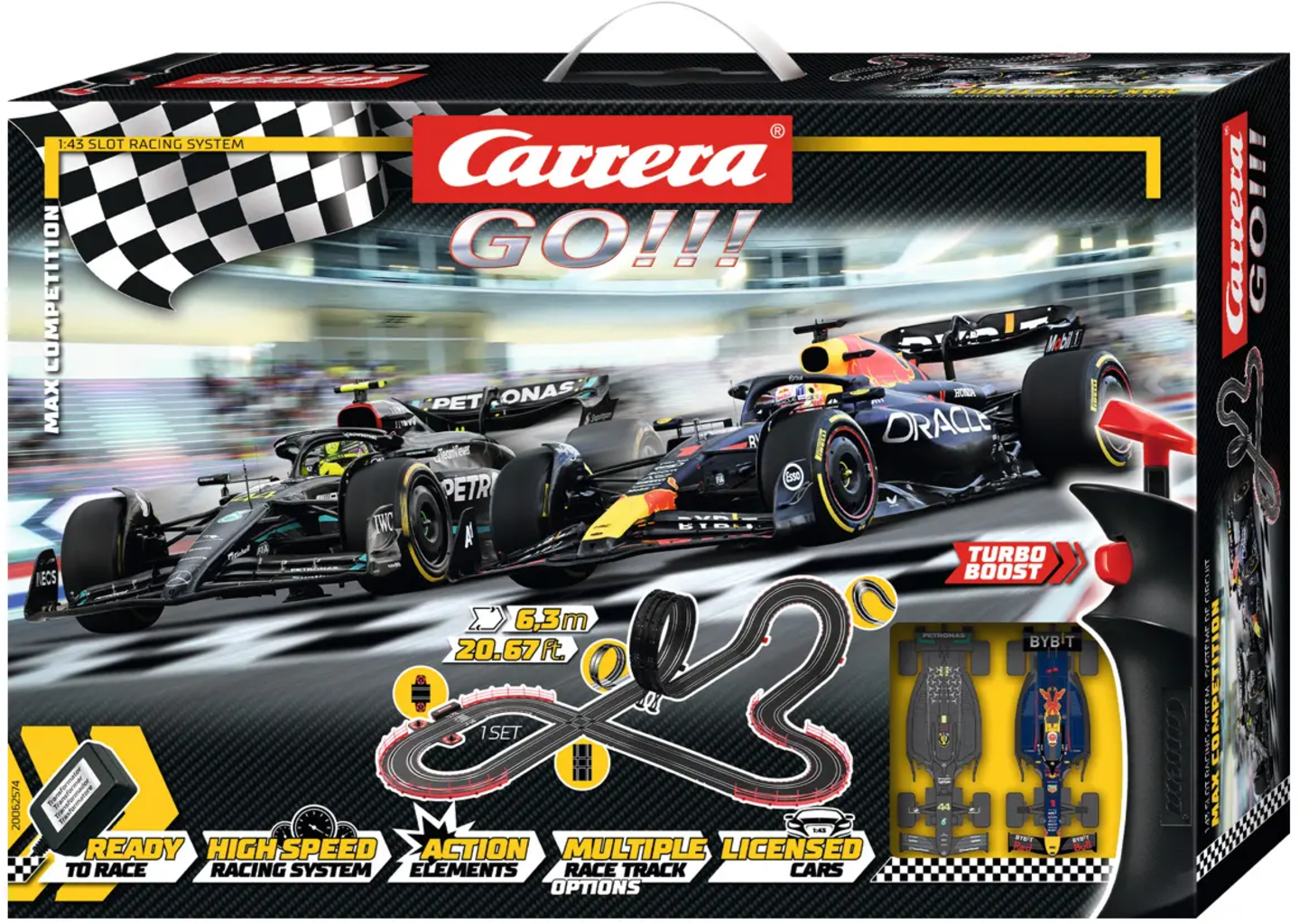 Lewis Hamilton eller Max Verstappen - vem kommer att segra i duellen mellan dessa F1-ikoner? Ta reda på det med Carrera GO!!! - Max Competition Starter Set! Den utmanande banan erbjuder adrenalinpumpande Formel 1-lopp i ditt eget hem varje gång.