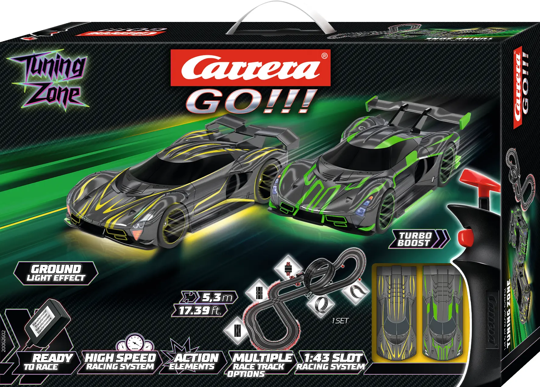 Dyk ner i en värld av trimmad racing och upplev en futuristisk duell på racerbanan! Carrera GO!!! Tuning Zone-setet erbjuder dig en actionfylld körupplevelse med spektakulära hyperbilar som inte bara är snabba utan också sticker ut tack vare sin snygga design med neonaccenter och underredesbelysning.