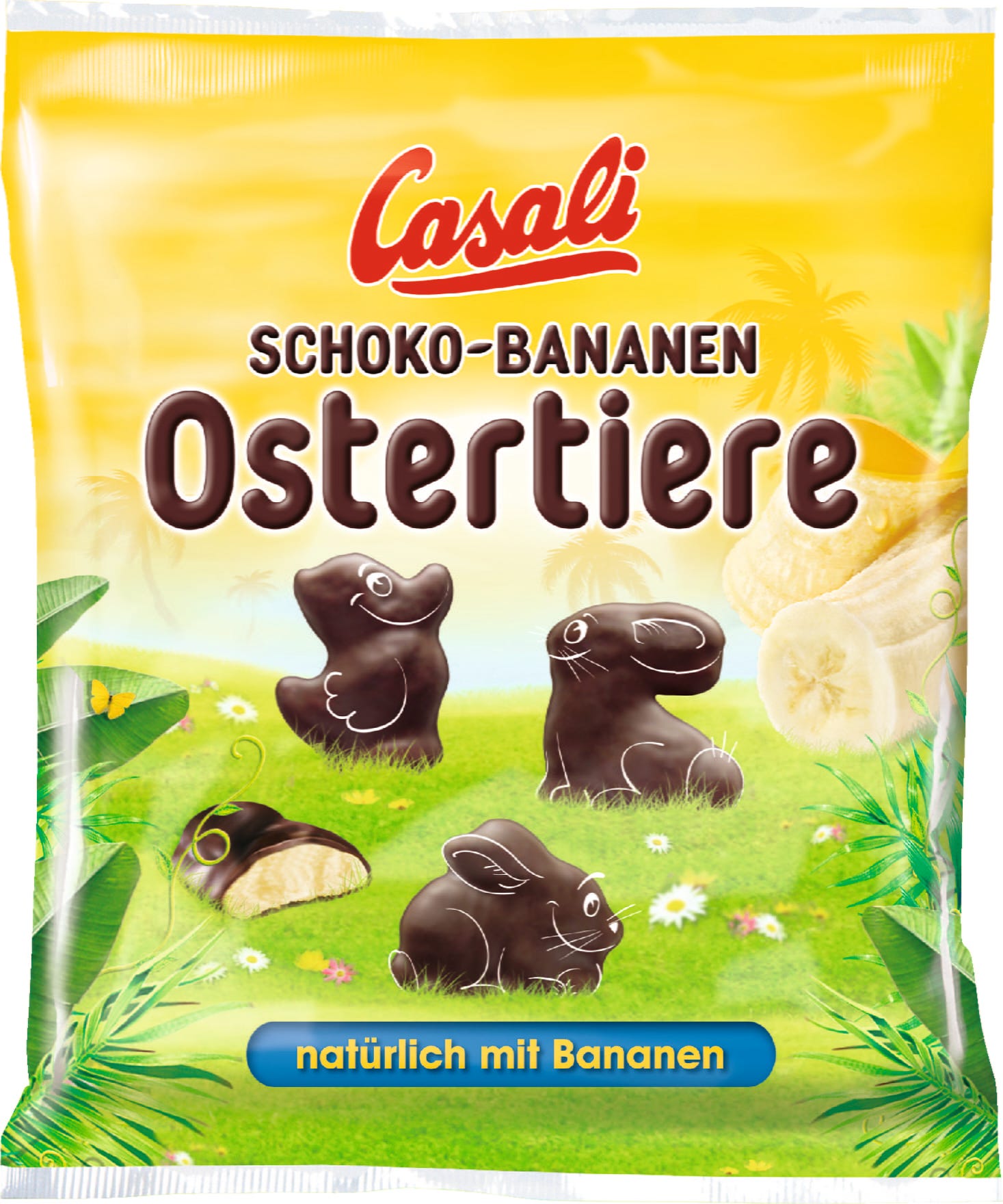 Casali chokladbanan påskdjur kombinerar delikat choklad med fruktigt bananskum för att skapa en godbit som omedelbart får dig att vilja ha mer. Med äkta bananmassa ger skummet en naturlig, fyllig banansmak. Noggrant utvalda ingredienser säkerställer att varje figur är en liten, söt stund i påsksäsongen. Vid korrekt förvaring håller sig påskdjuren fräscha länge och behåller sin mjuka, smakrika konsistens.