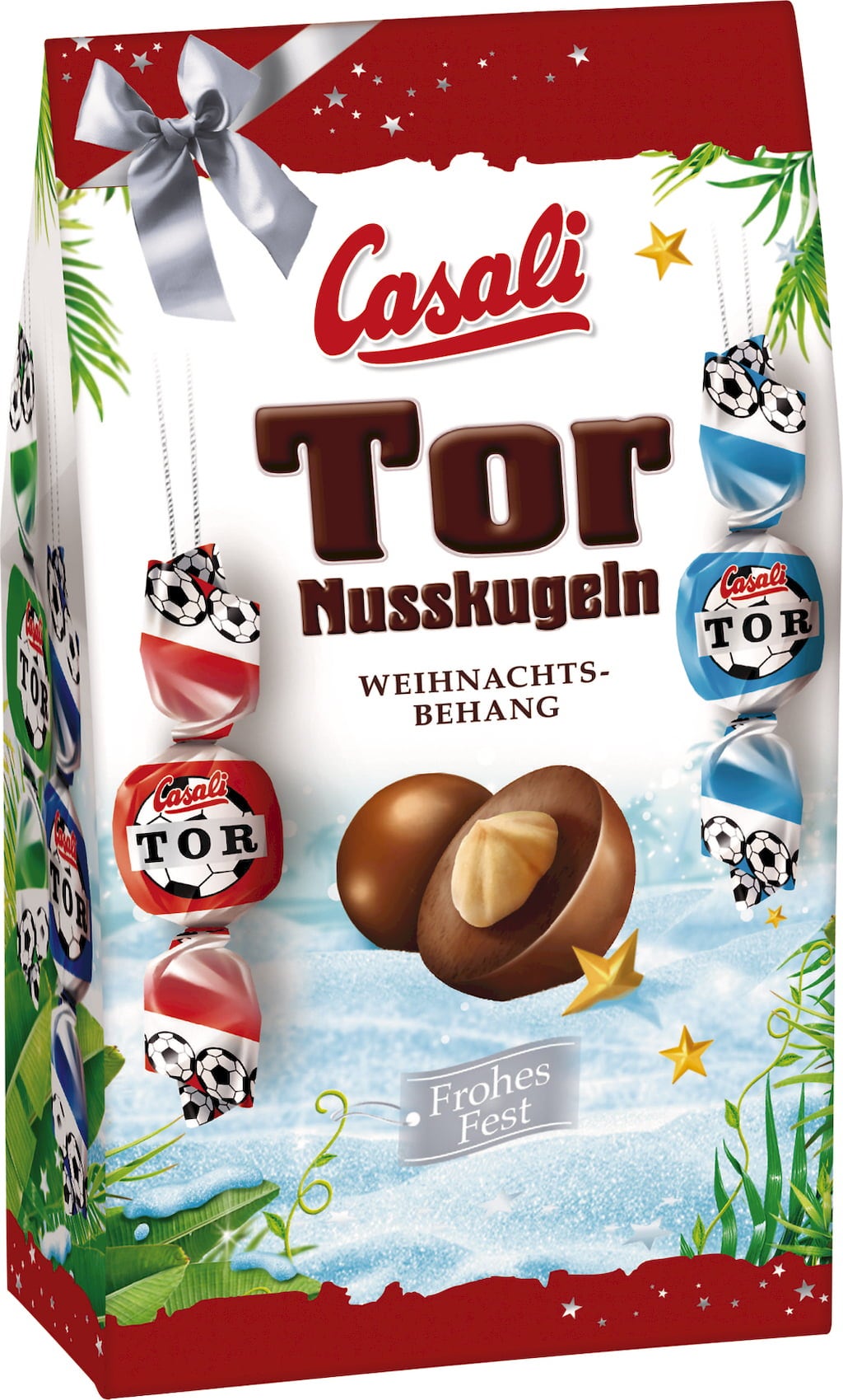De färgglada mål-nötsbollarna från Casali är populära bland barn. De är ju inte bara glada färgklickar i julgranen, utan smakar framför allt gott: ett tjockt lager delikat choklad omsluter en krispig, hel hasselnöt.
