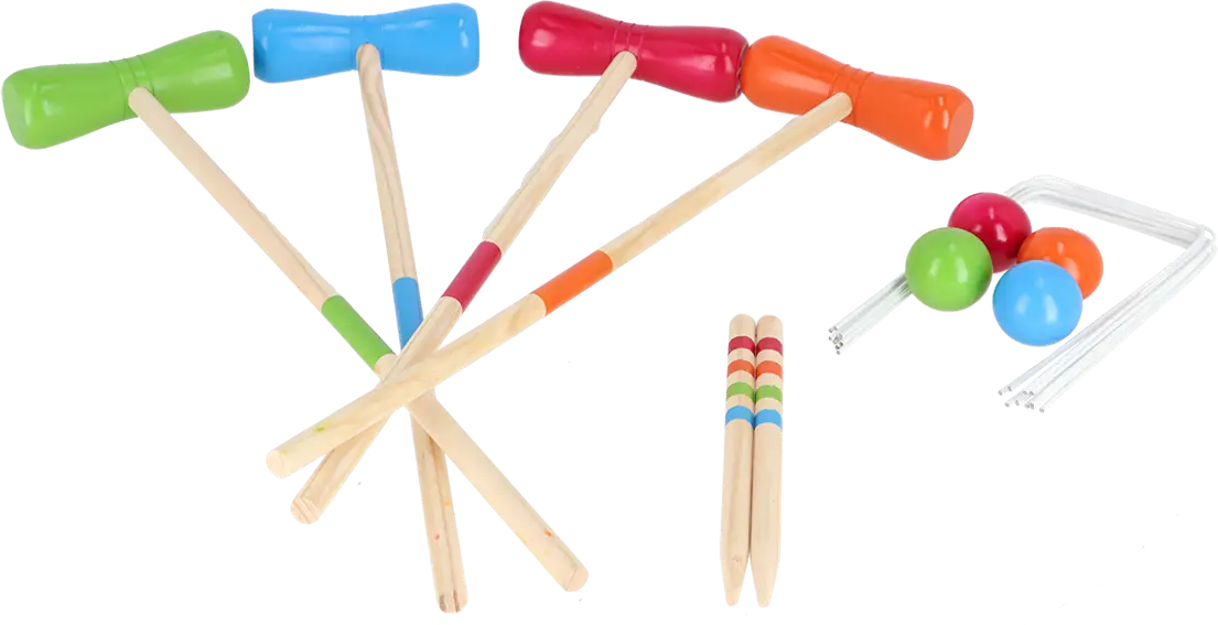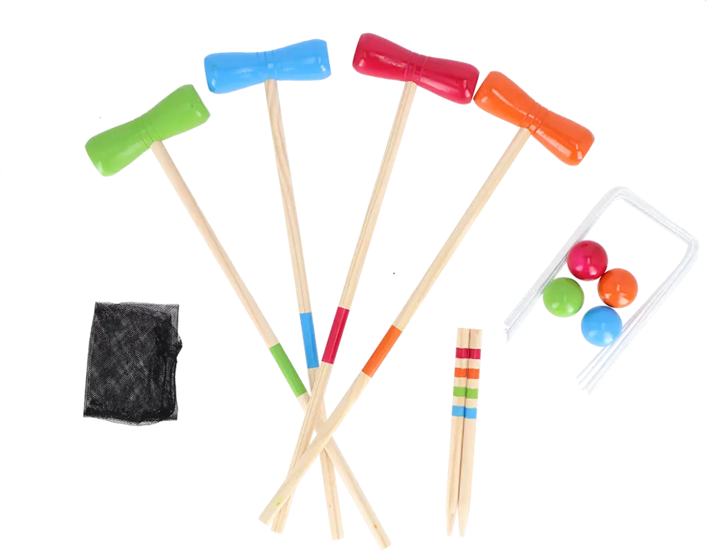 - Krocketset med 4 träklubbor, 4 bollar och metallbågar