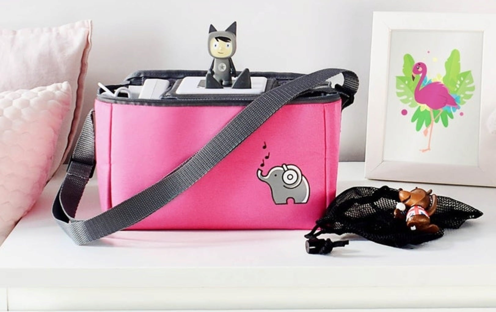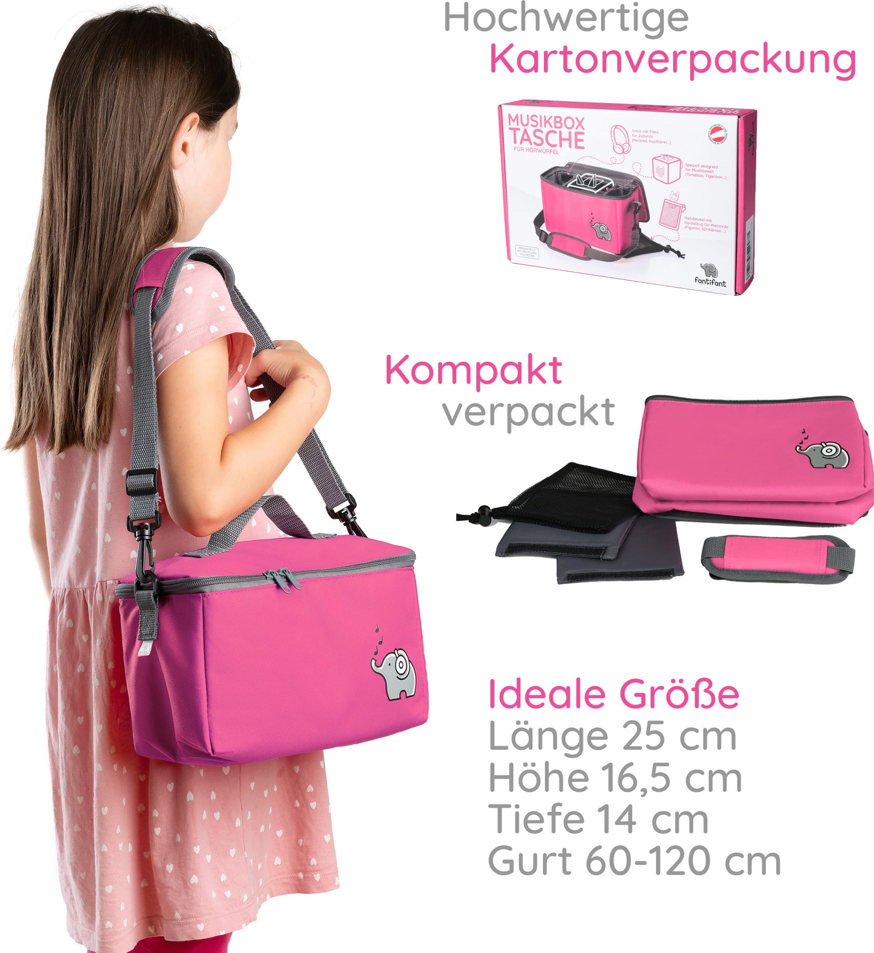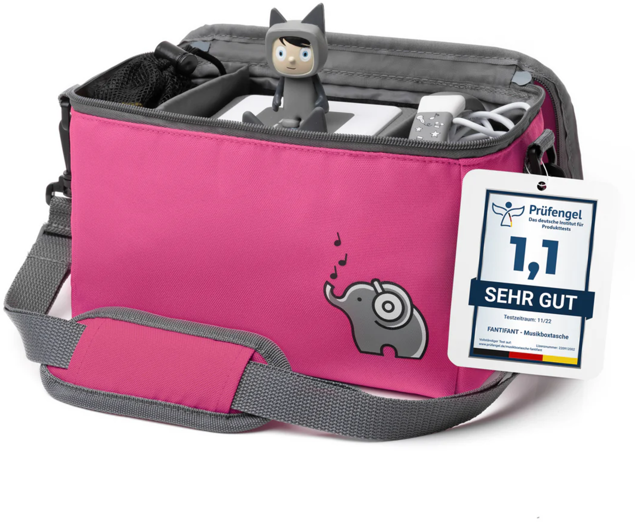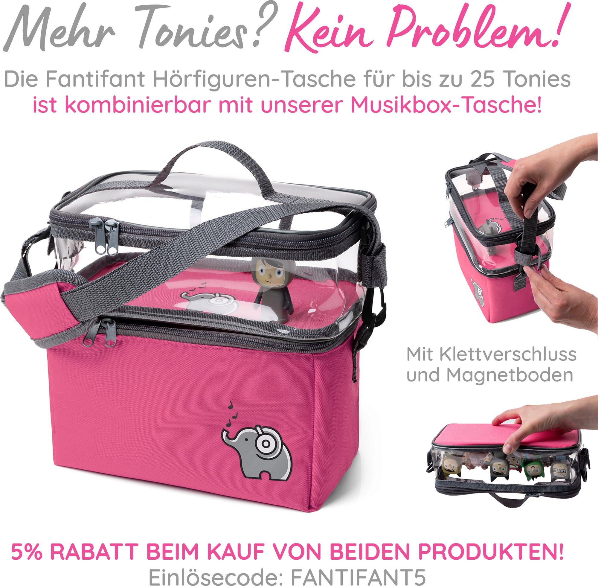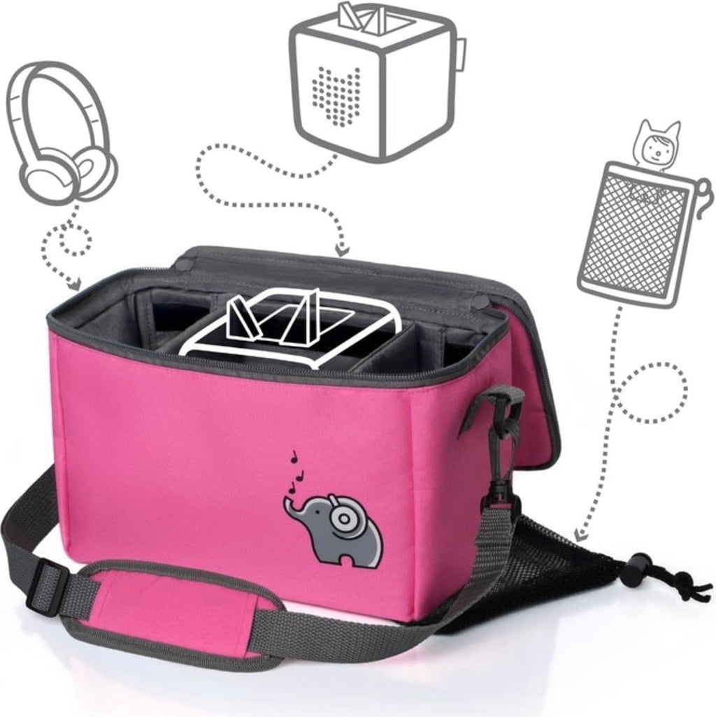 Färgglad väska med gott om plats för din speldosa och alla dina favoritkaraktärer. Ytterligare tillbehör är också i goda händer i den medföljande meshväskan. Storleken på innerfacken kan väljas fritt med kardborreband. Locket kan öppnas helt så att jukeboxen även kan användas i väskan.