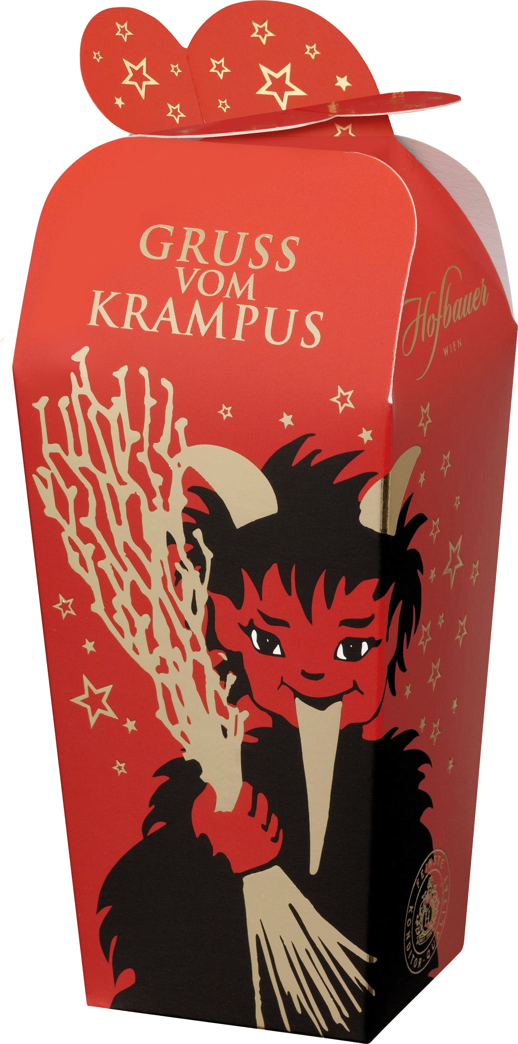 Låt dig frestas av den fräcka Krampusen och njut av utsökta konfektpraliner som perfekt värmer dig inför julen. Krampus-kogern är full av läckra överraskningar: saftiga bakade äpple- och vaniljchoklader, krämig mjölktryffelbundtkaka, fin marsipan täckt med mörk choklad och utsökta Mozartkugeln i mörk choklad. Varje pralin är ett litet mästerverk och garanterar festliga stunder av njutning – perfekt att dela eller unna sig själv.