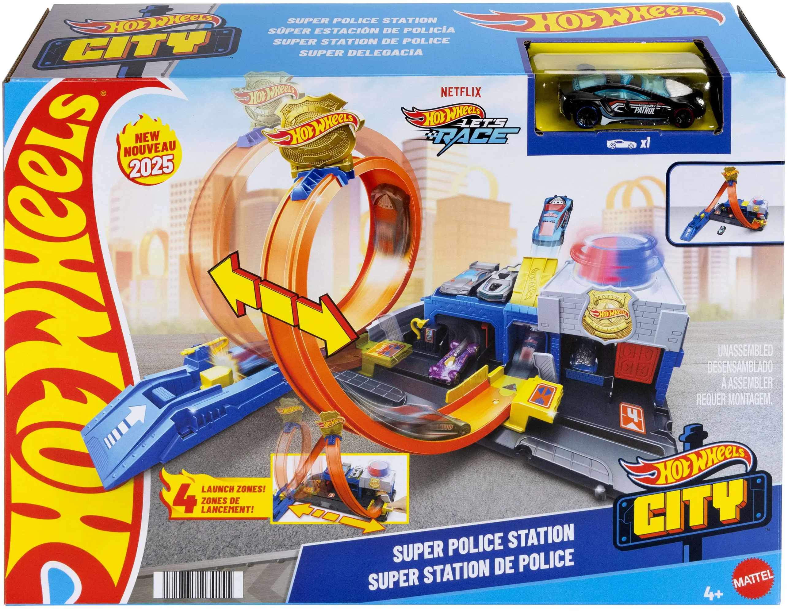 Hot Wheels City Superpolisstation bjuder på varierad racing- och stuntaction i en fartfylld miljö. Med den medföljande polisbilens hjälp kan barn starta med ett race och välja mellan fyra olika banor – inklusive looping, hårnålskurva, rampstunt eller sirenalarm. Varje väg bjuder på ny spänning! Setet har även en tankstation med rörlig slang för att fylla på "bränsle". Upp till fyra bilar kan parkeras, och via det smidiga kopplingssystemet kan setet enkelt kombineras med andra Hot Wheels-banor.