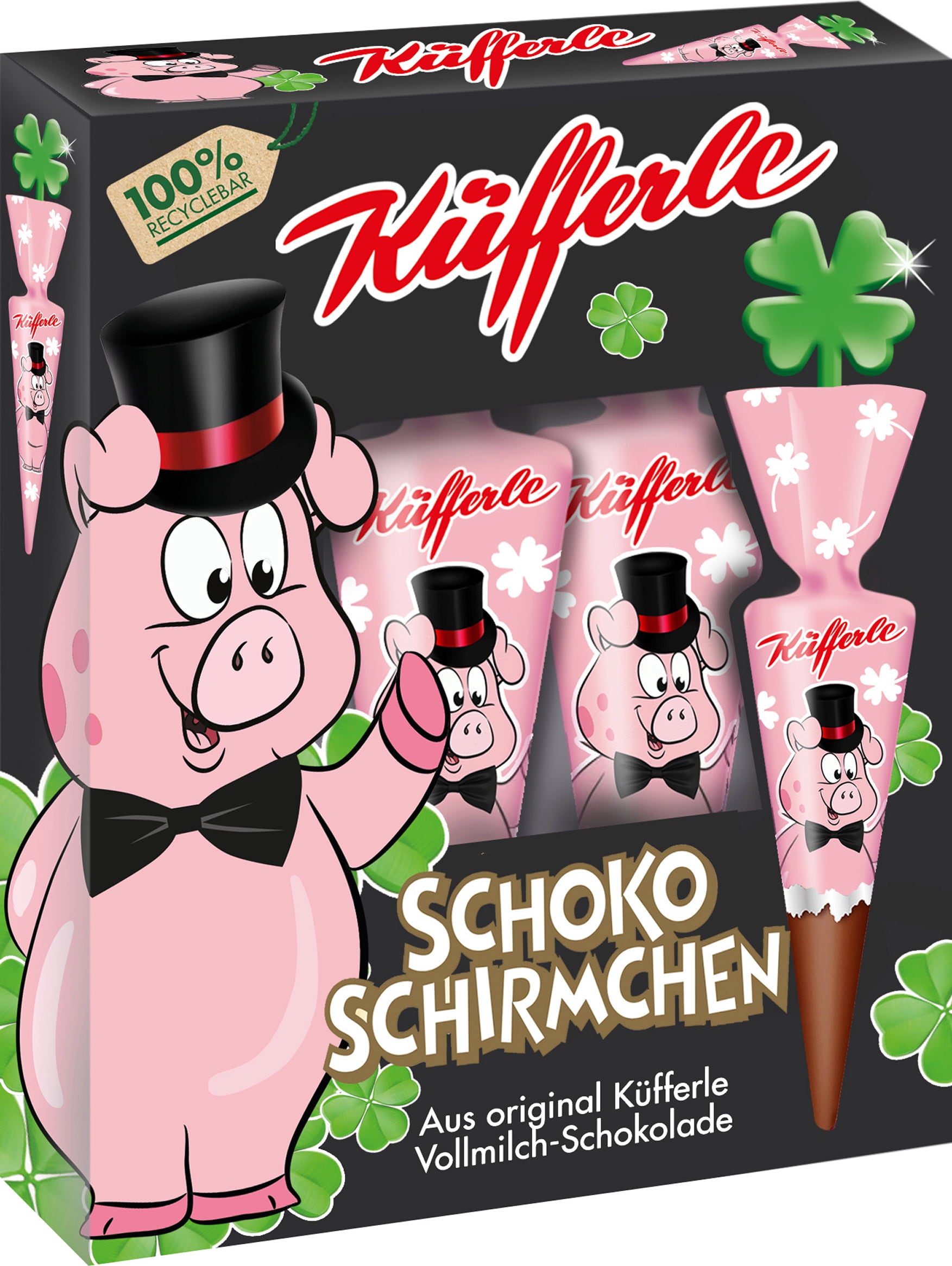 Denna förpackning innehåller fyra ömt smältande Küfferle-chokladparaplyer gjorda av mjölkchoklad med gris och fyrklöver. En hit som present vid nyårsfirandet.