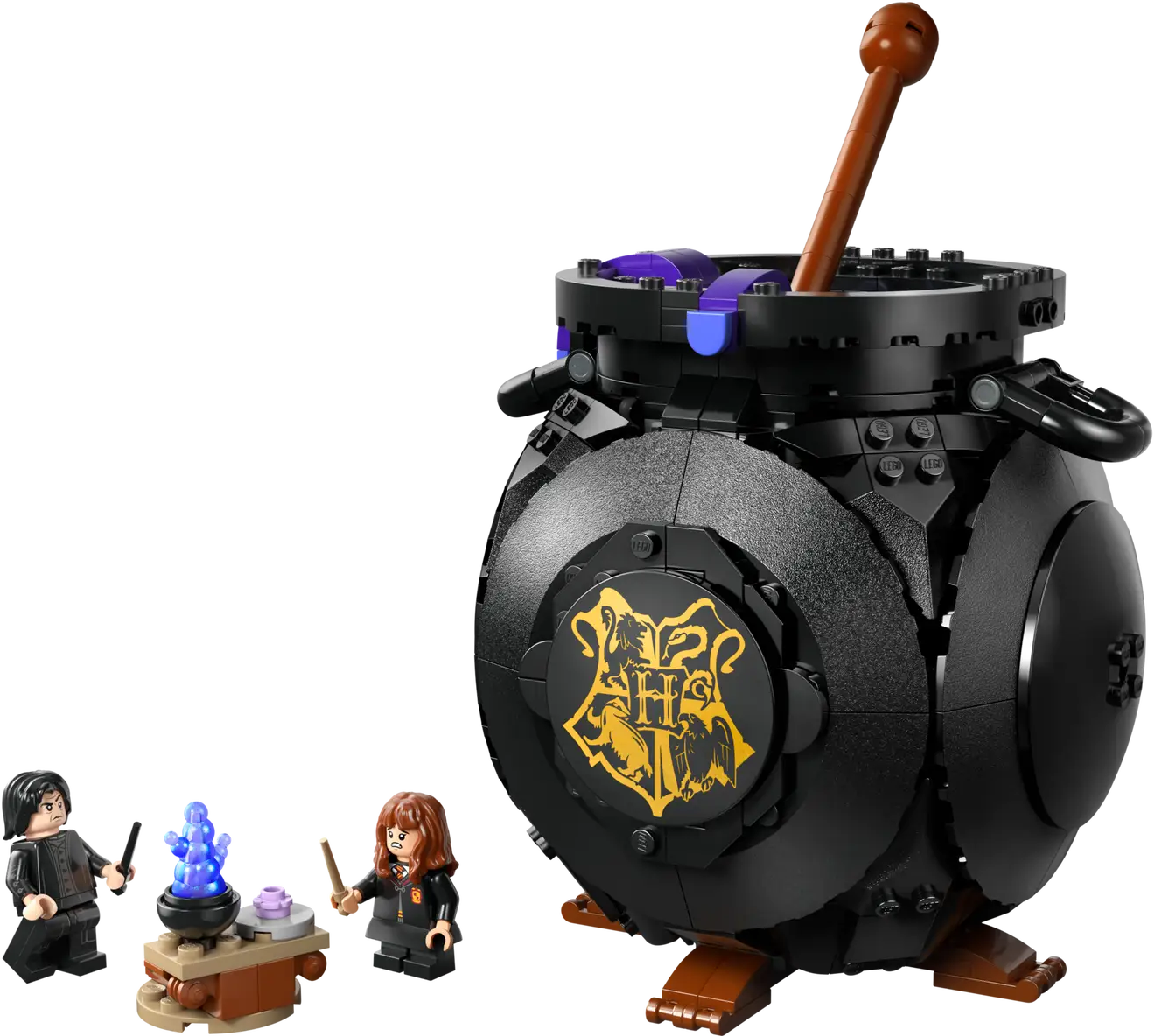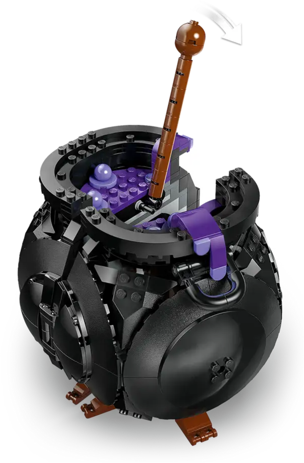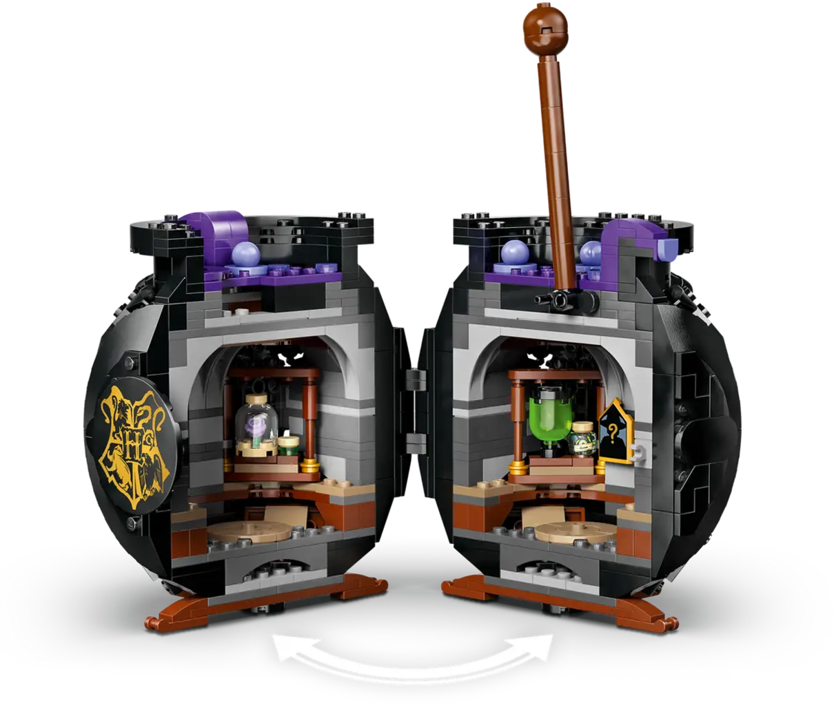 - Öppna kitteln och upptäck det hemliga klassrummet där trolldryckslektioner pågår. Bord, svarta tavlan, flaskor och andra ingredienser kan tas bort för lek.