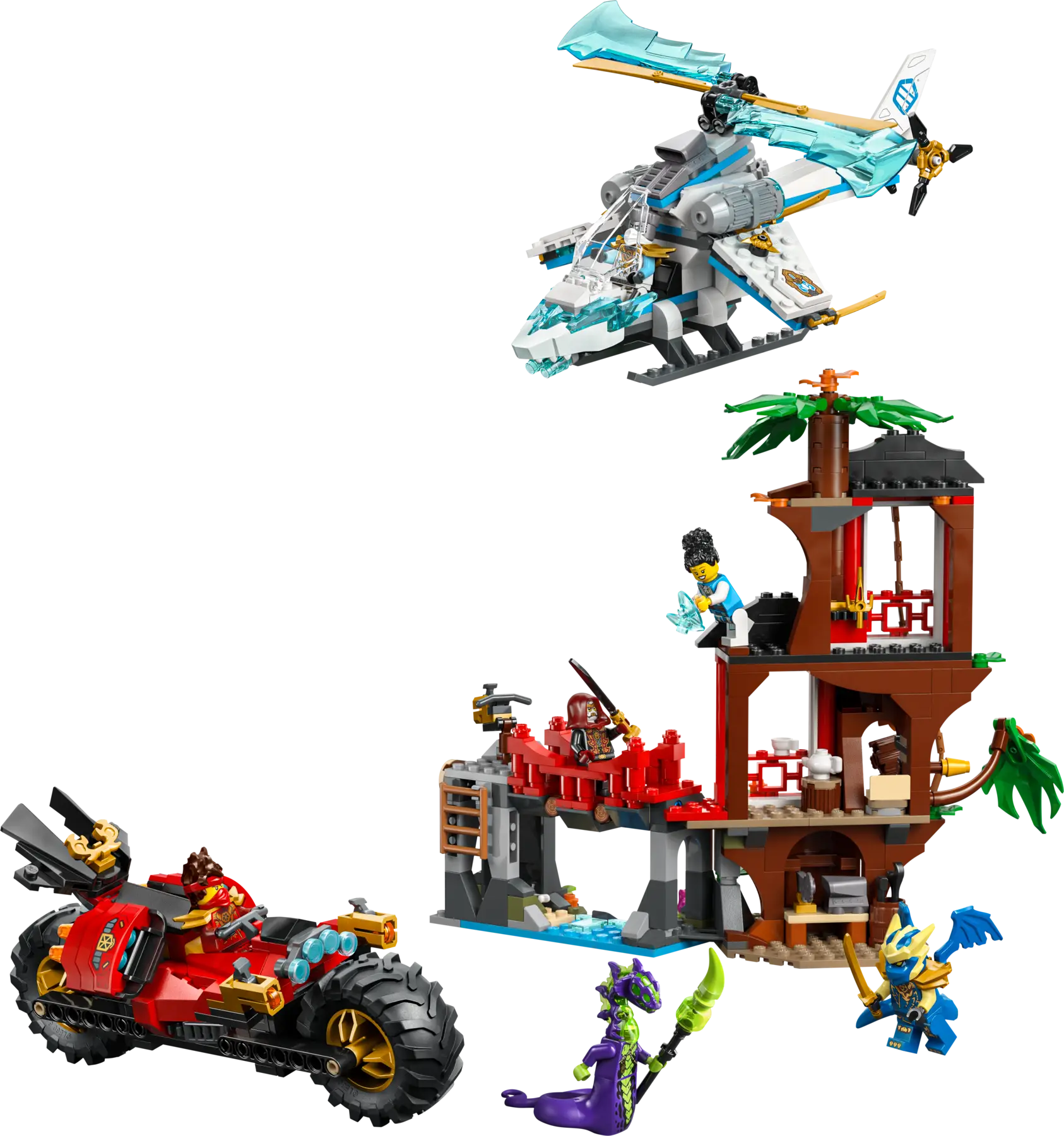 - Innehåller trädkoja, ninjamotorcykel och helikopter med rörliga och autentiska detaljer