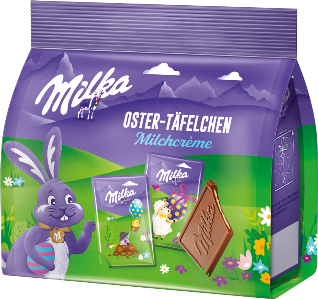 15 individuellt inslagna barer gjorda av klassisk Milka Alpine mjölkchoklad, fyllda med delikat mjölkkräm, kommer att skämma bort både unga och gamla. Den glada chodladen förvandlar påskkorgar mm till färgglada blickfång och sötar även soffbordet!