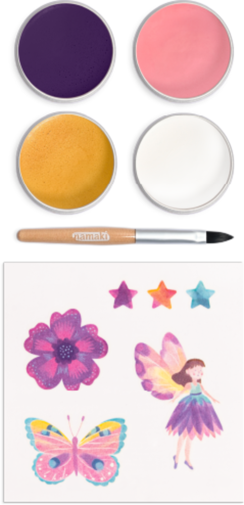 Fjärilsmakeupsetet innehåller burkar i rosa, lila, gyllengult och vitt, vilket gör det enkelt att skapa designer som en fjäril, en älva, blommor eller till och med en söt prinsessa. Det medföljande arket med tillfälliga tatueringar kompletterar designen perfekt!