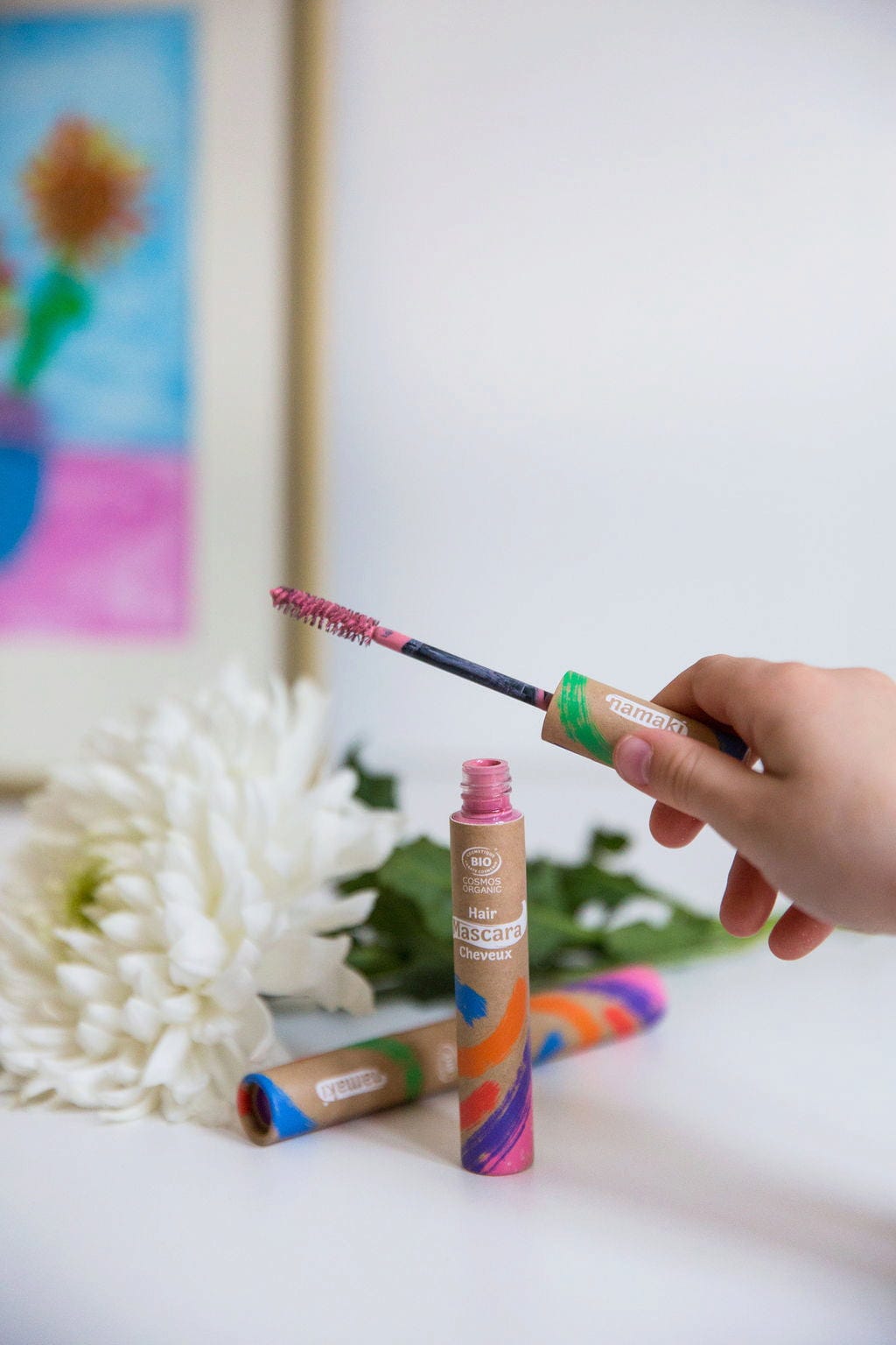 Hårmascarorna från namaki låter barns hår lysa i regnbågens färger på ett naturligt sätt och tack vare deras säkra formula. Aloe vera, glycerin och akaciagummi gör mascaran skonsam, lätt att applicera och lätt att tvätta ur.