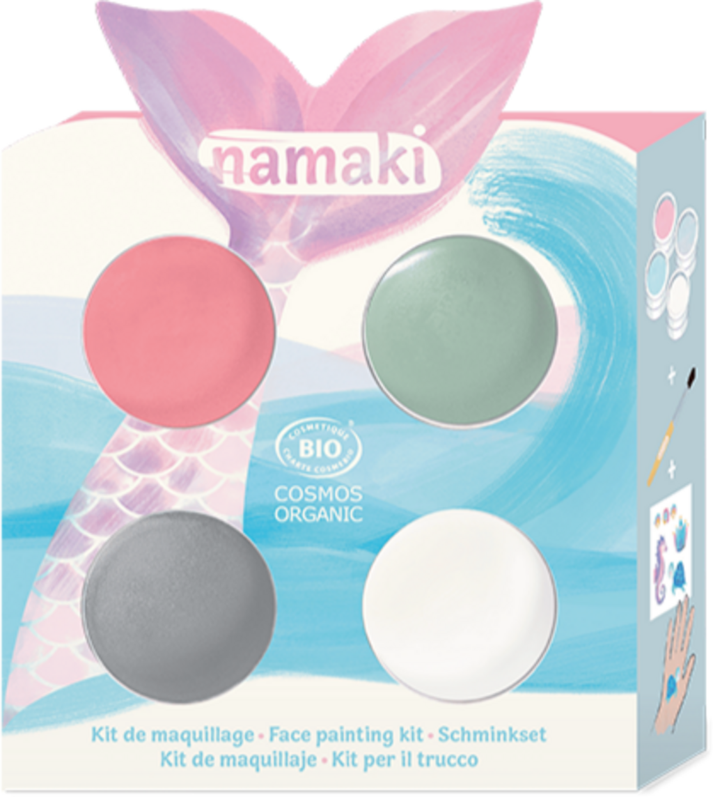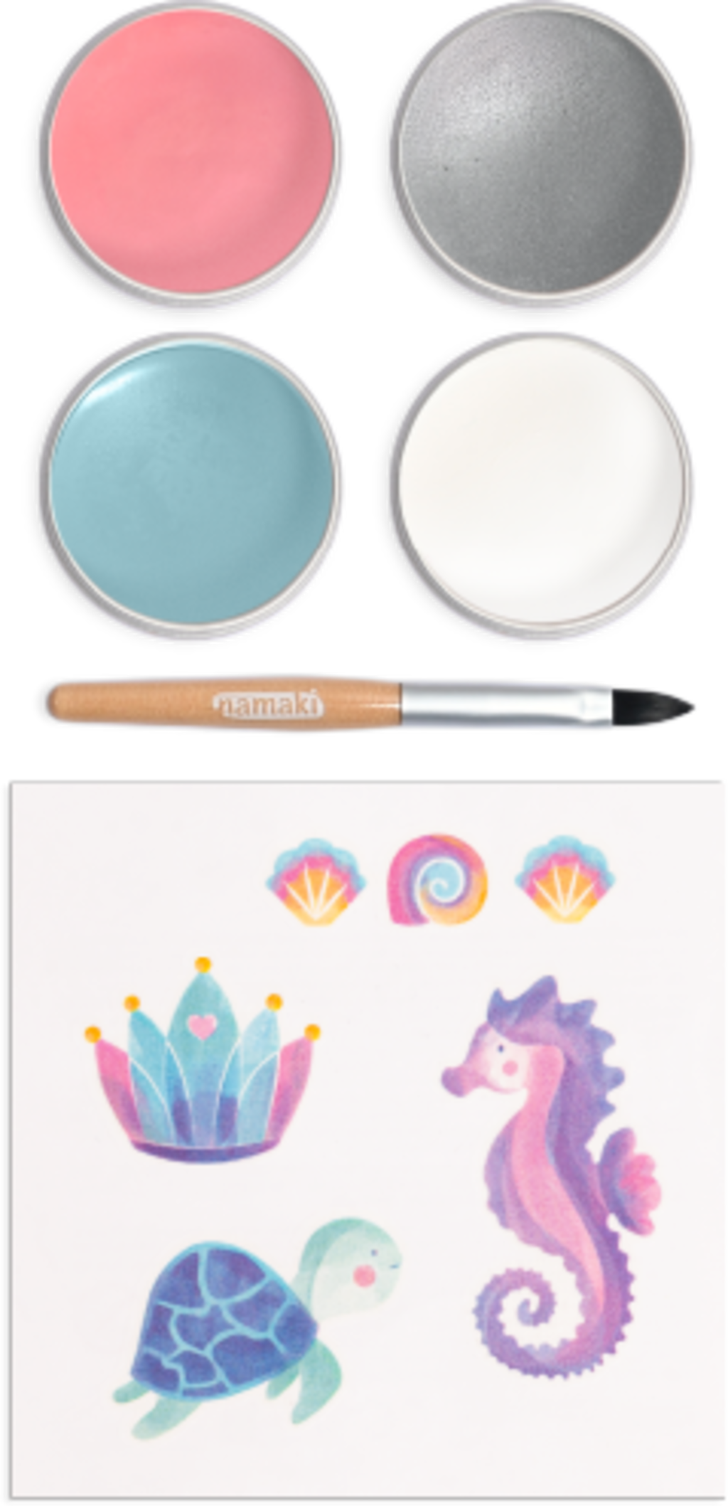 Sjöjungfru-sminksetet innehåller burkar i rosa, ljusblått, silvergrått och vitt, vilket gör det enkelt att skapa en sjöjungfru-, snäck-, snöfling- eller till och med snödrottning-look. Det medföljande arket med tillfälliga tatueringar kompletterar sminklooken perfekt!