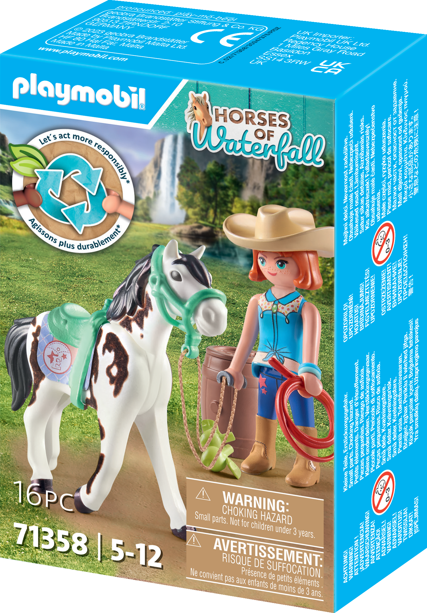 Tillbehör: 1 ridhjälm, 1 sadel, 1 schabrake, 1 grimma, 1 snöre med handtag, 2 äpplen, 1 lasso, 1 tunna, 1 hatt