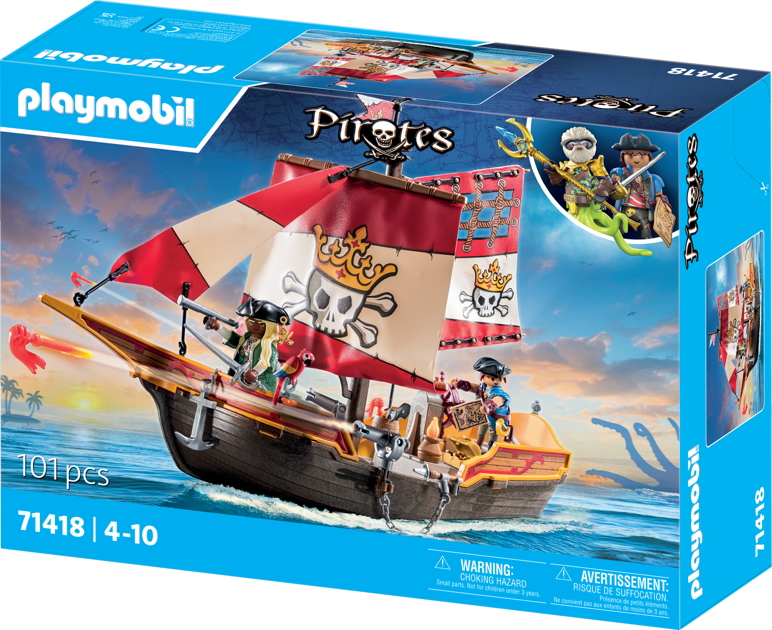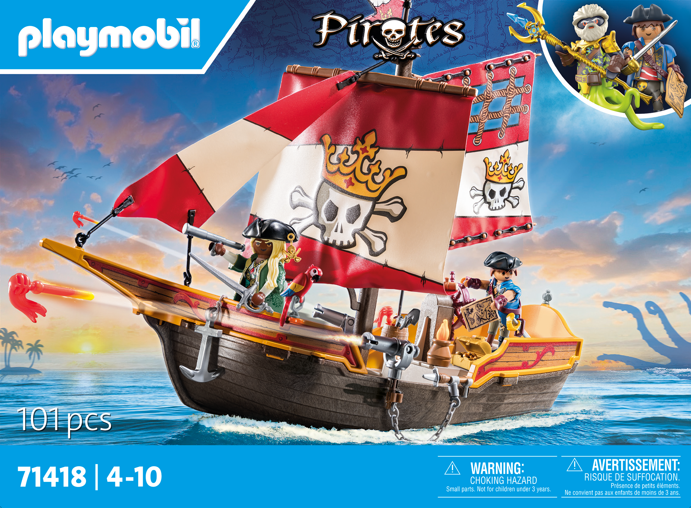 Tillbehör: 1 piratskepp, 1 ankare med rep, 2 kanoner, 3 projektiler, 1 tunna, 1 skattkista med mynt, 1 skattkarta, 1 kompass, 1 spade, 1 krokstång, 1 eldgryta, 1 yxa, 2 spjut, 2 kedjor, 2 sablar, 1 teleskop, 1 flagga, 1 flaggstång, 2 pirathattar, 1 sittpinne för papegoja