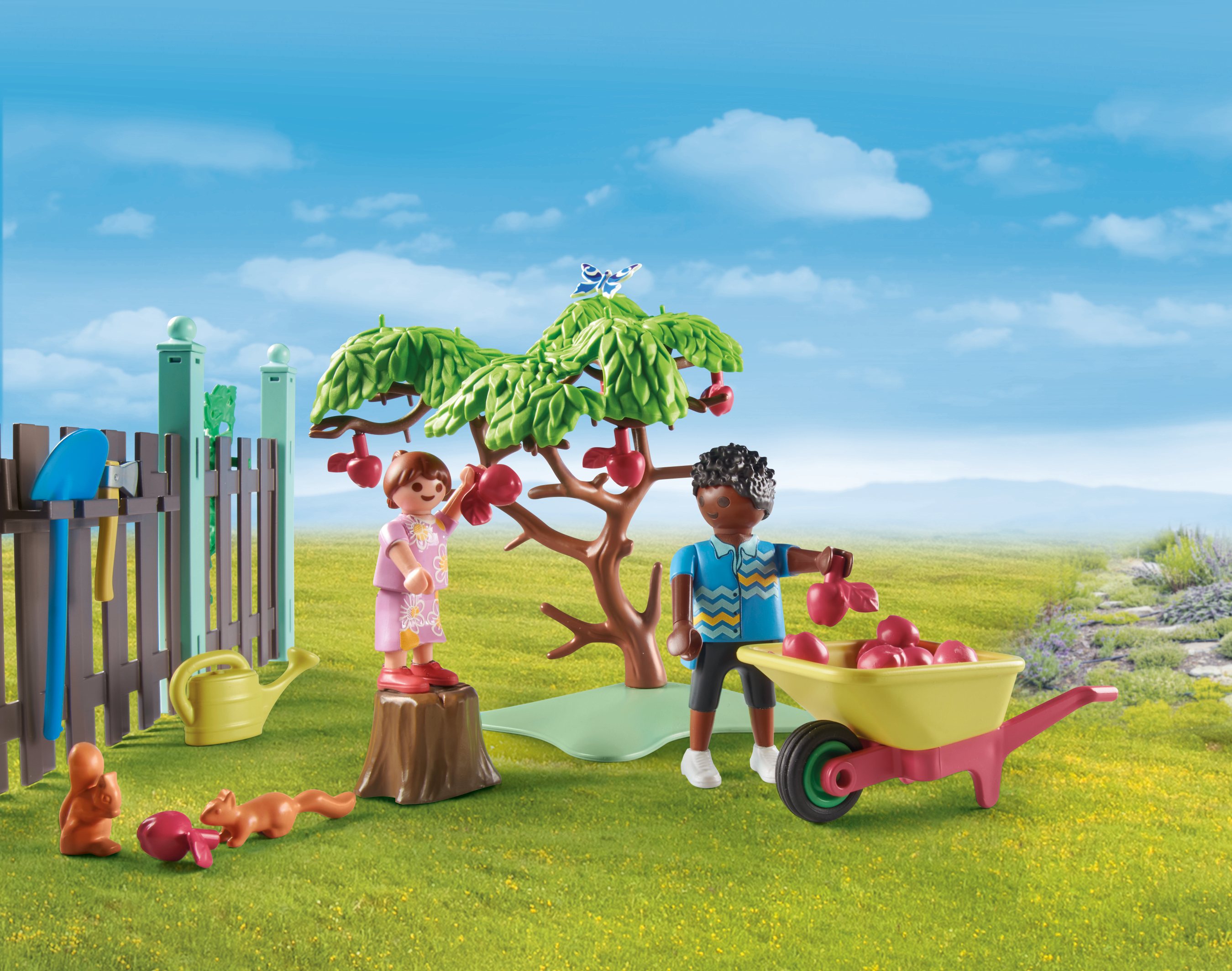 Tillbehör: 1x dynghög, 1x hundkoja, 1x kaninbur med höhäck, 1x träd, 12x äpple, 1x staket med stolpar, 1x vedstapel i 2 delar, 1x huggkäpp, 1x yxa, 1x picknickkorg, 1x tunna, 1x skottkärra, 1x spade, 2x hacka, 1x skära, 1x rosensax, 1x lövkratta, 1x vattenkanna, 2x ägg, 1x murgröna med blommor