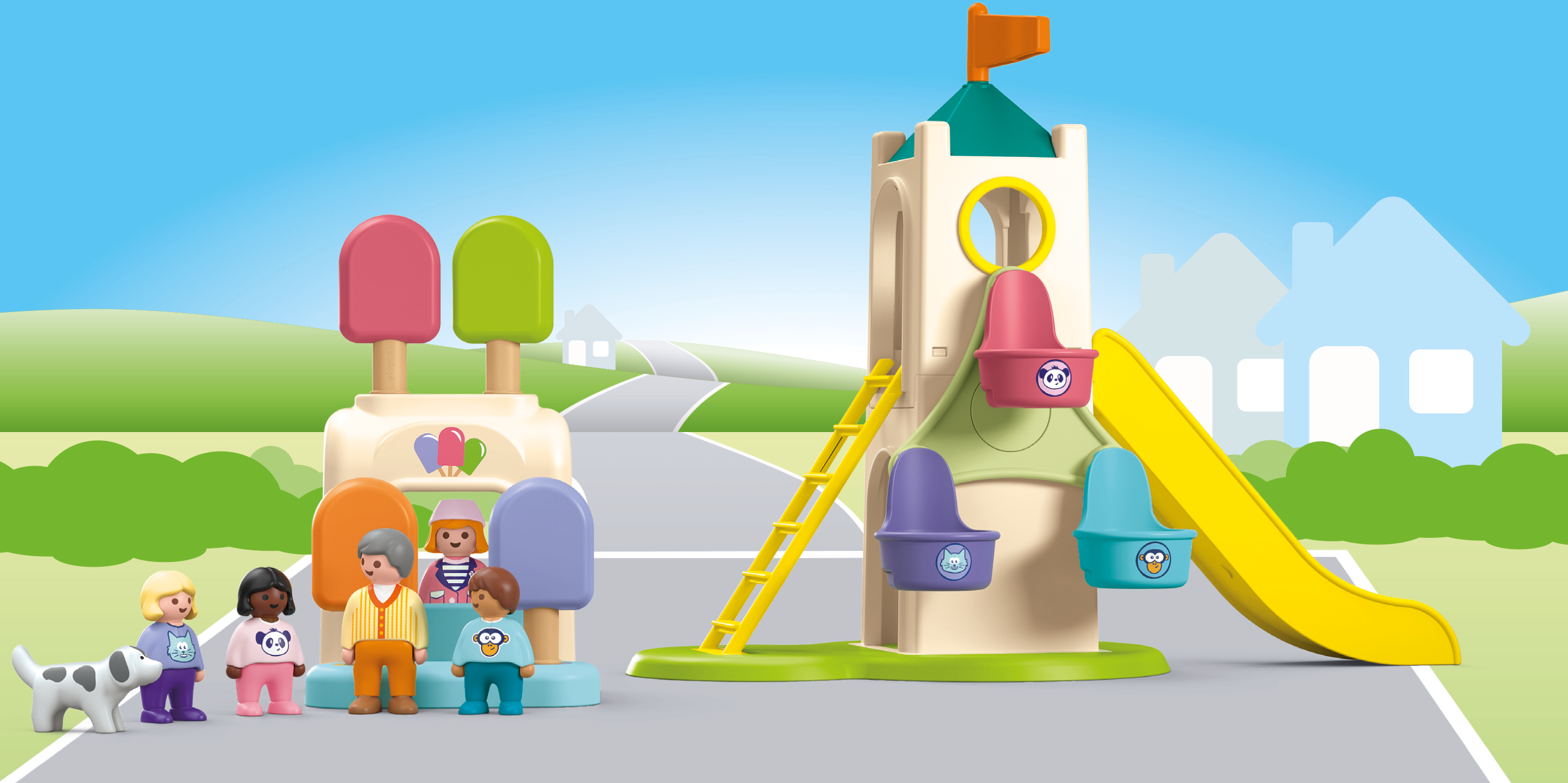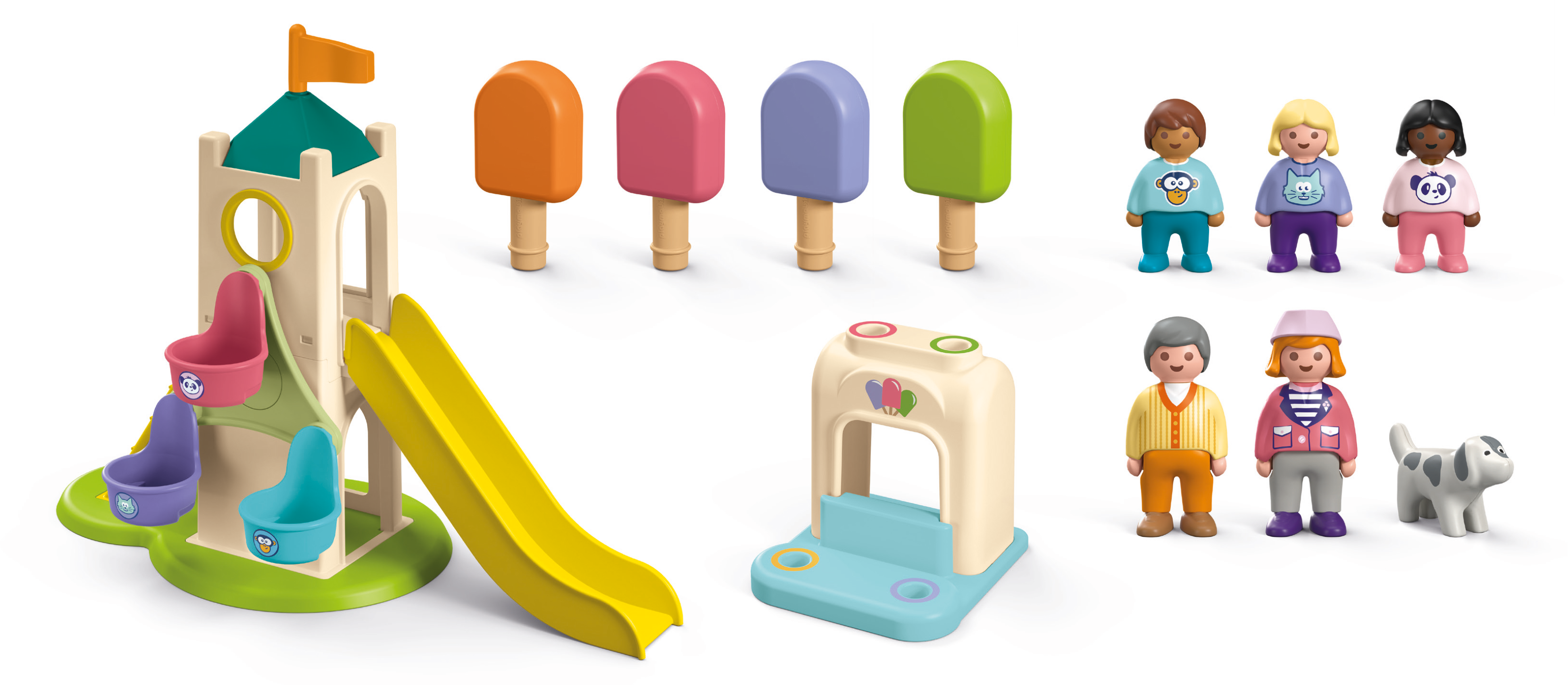 Tillbehör: 1 torn med rutschkana, pariserhjul och stege, 1 glasskiosk, 4 glasspinnar