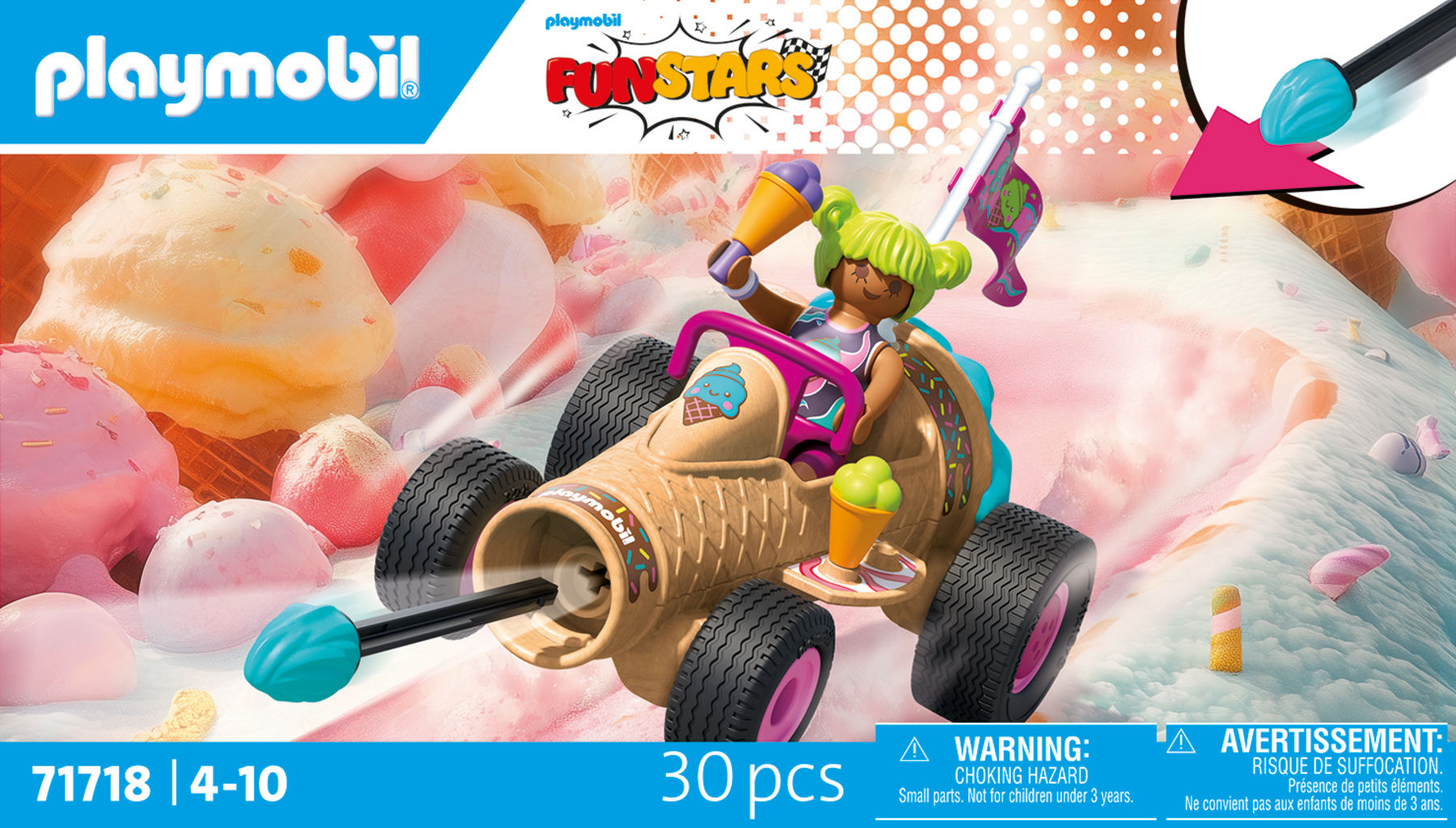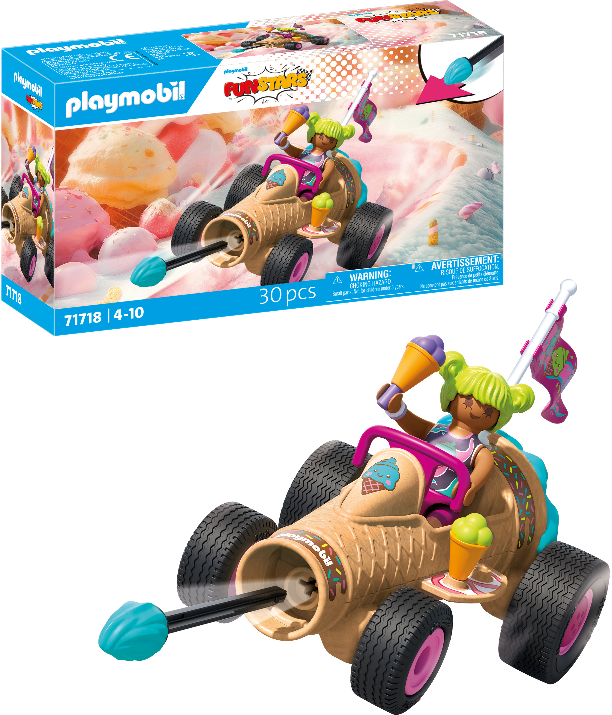 "Racing Glasstrut" garanterar fantasifulla glassstrider och vilda tävlingar. Glassförsäljaren styr det konformade fordonet, komplett med glasskanon, glasstrutar och flagga, genom dessertarenan. Perfekt för kreativa rollspel, lagdueller och massor av skratt!