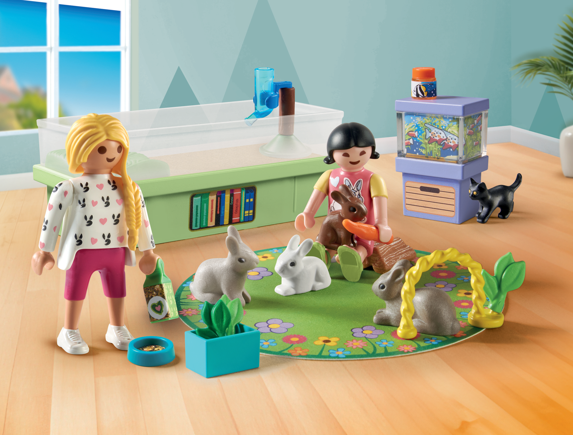 Tillbehör: 1 kaninbur, 1 akvarium, 1 utrullningsbar lekmatta, 1 matlåda, 1 vattendispenser, 1 matskål, 1 lekark