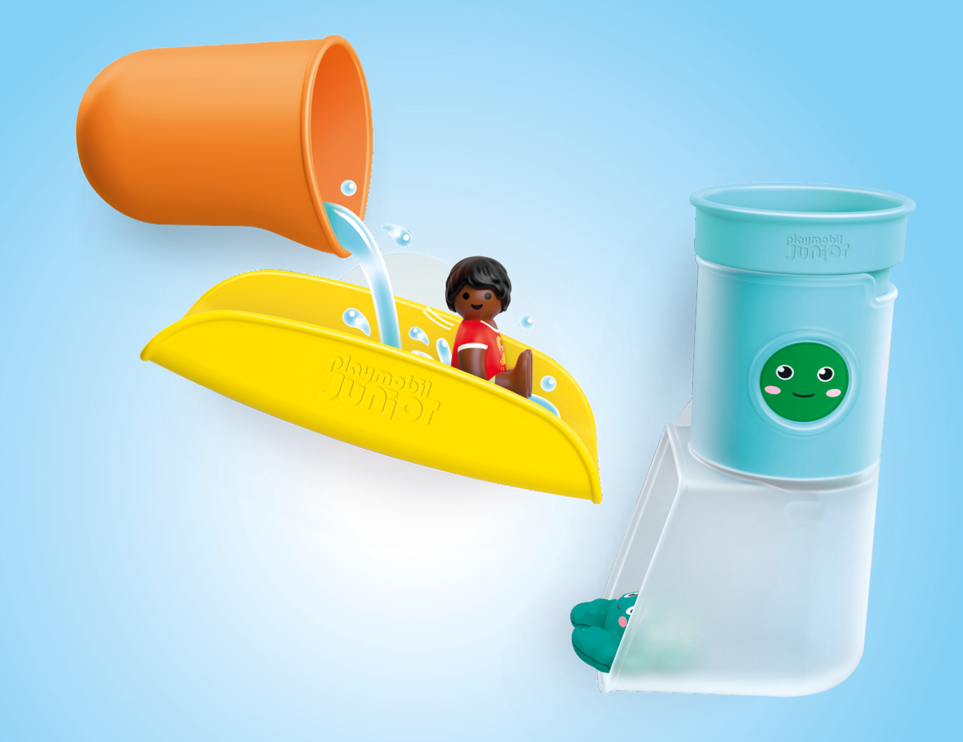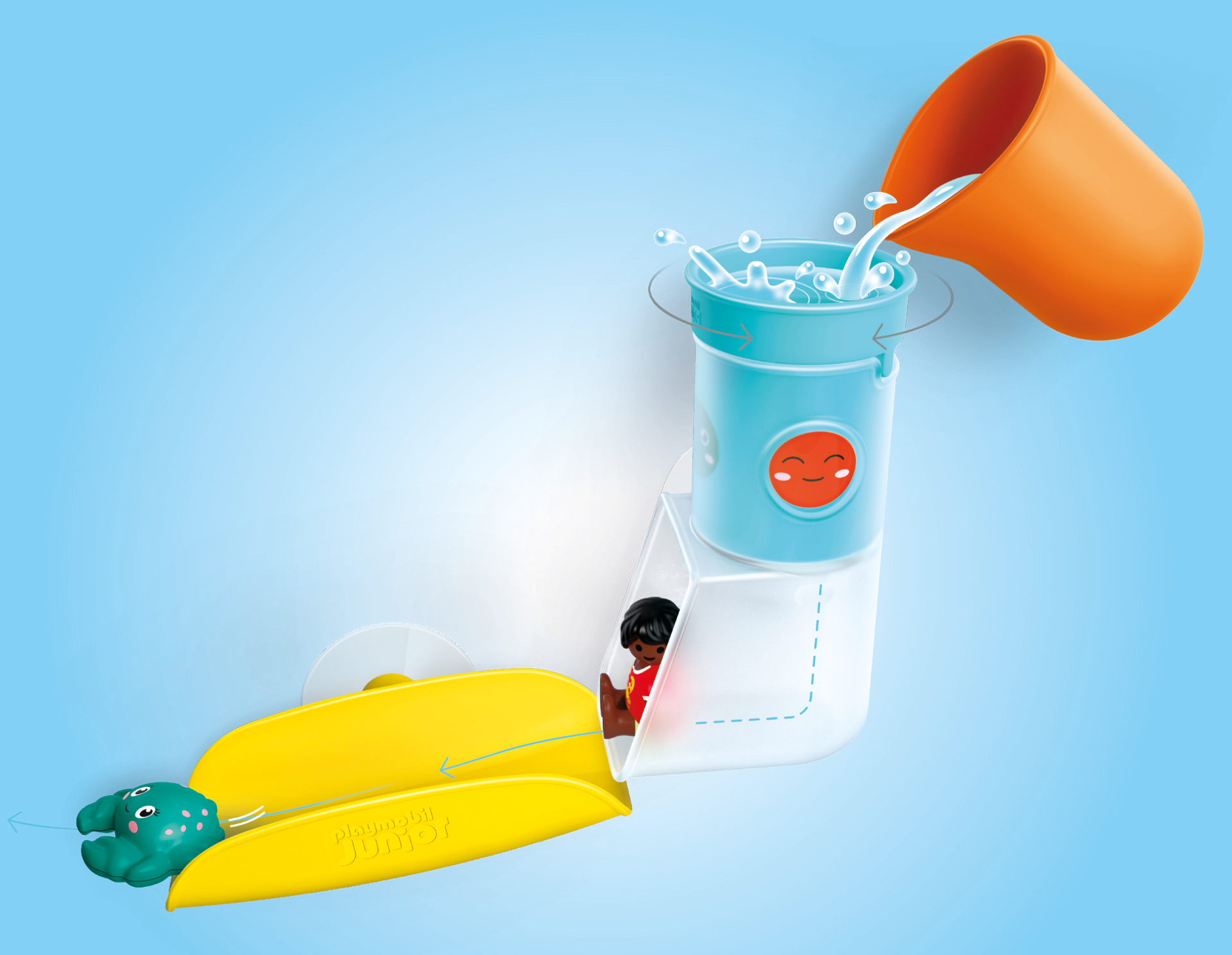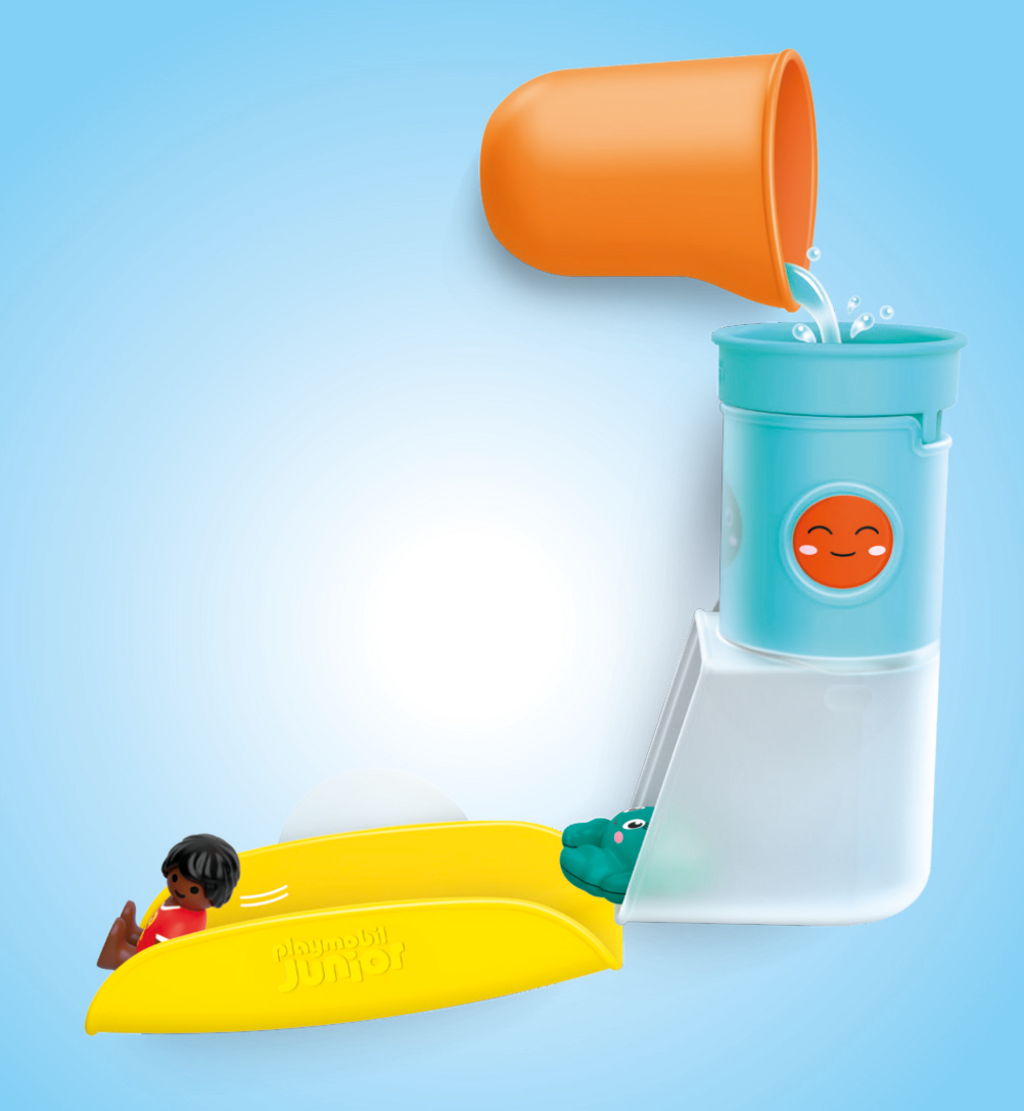 En actionfylld badstund väntar! Den lille pojken och hans fräcka krabba susar nerför rutschkanan, medan vatten från tanken ger extra fart. Snurra, häll, rutschkana – om och om igen! Fästs snabbt på badkaret eller de släta kakelplattorna, det roliga börjar direkt.