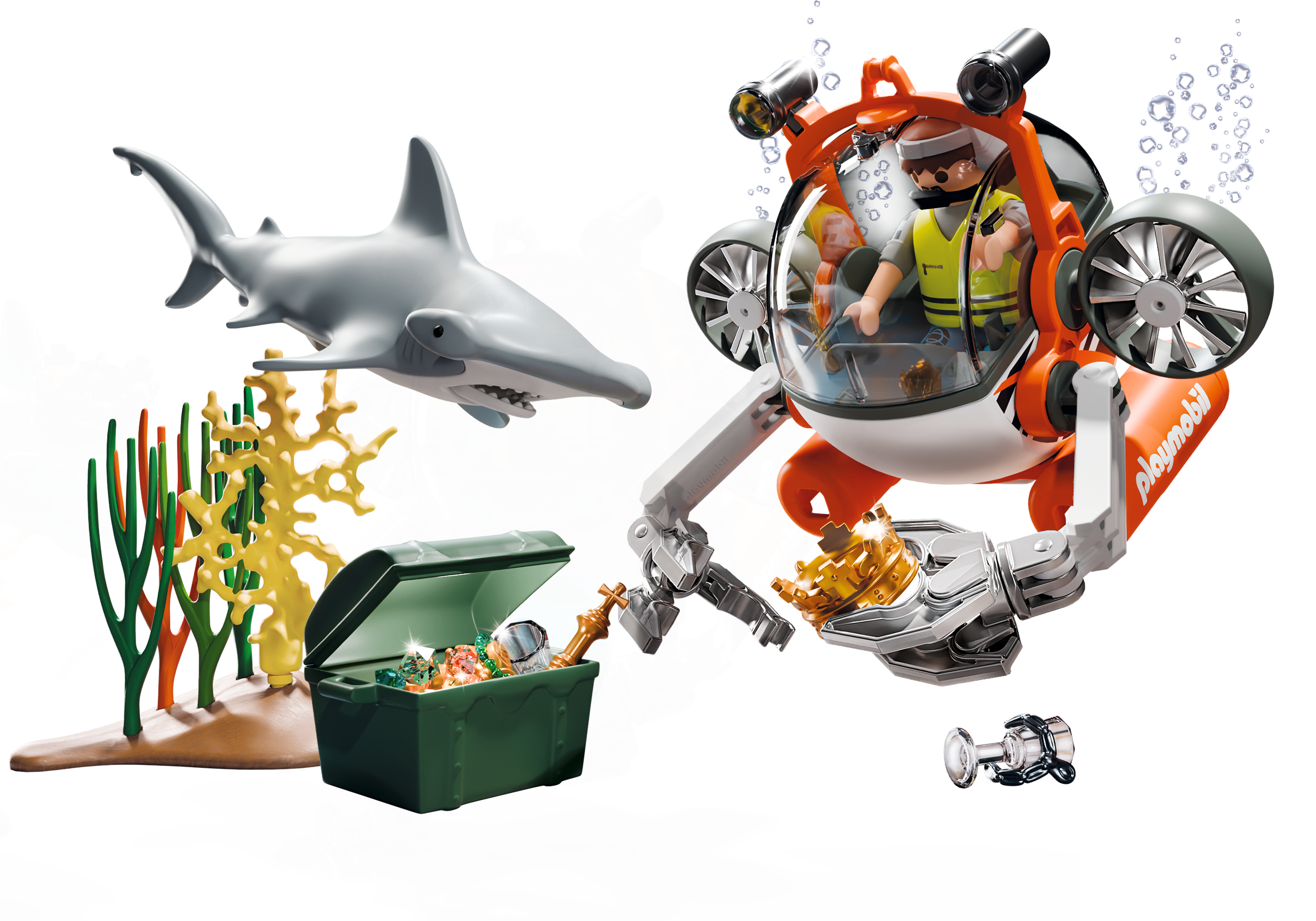 Innehåll: 1 ubåtskapten med hjälm och mikrofon, 1 hammarhaj, 1 ubåt, 1 skattkista, guldmynt, juveler, 1 spira, 1 krona, 1 vinglas, 1 korallrev med bottenplatta.