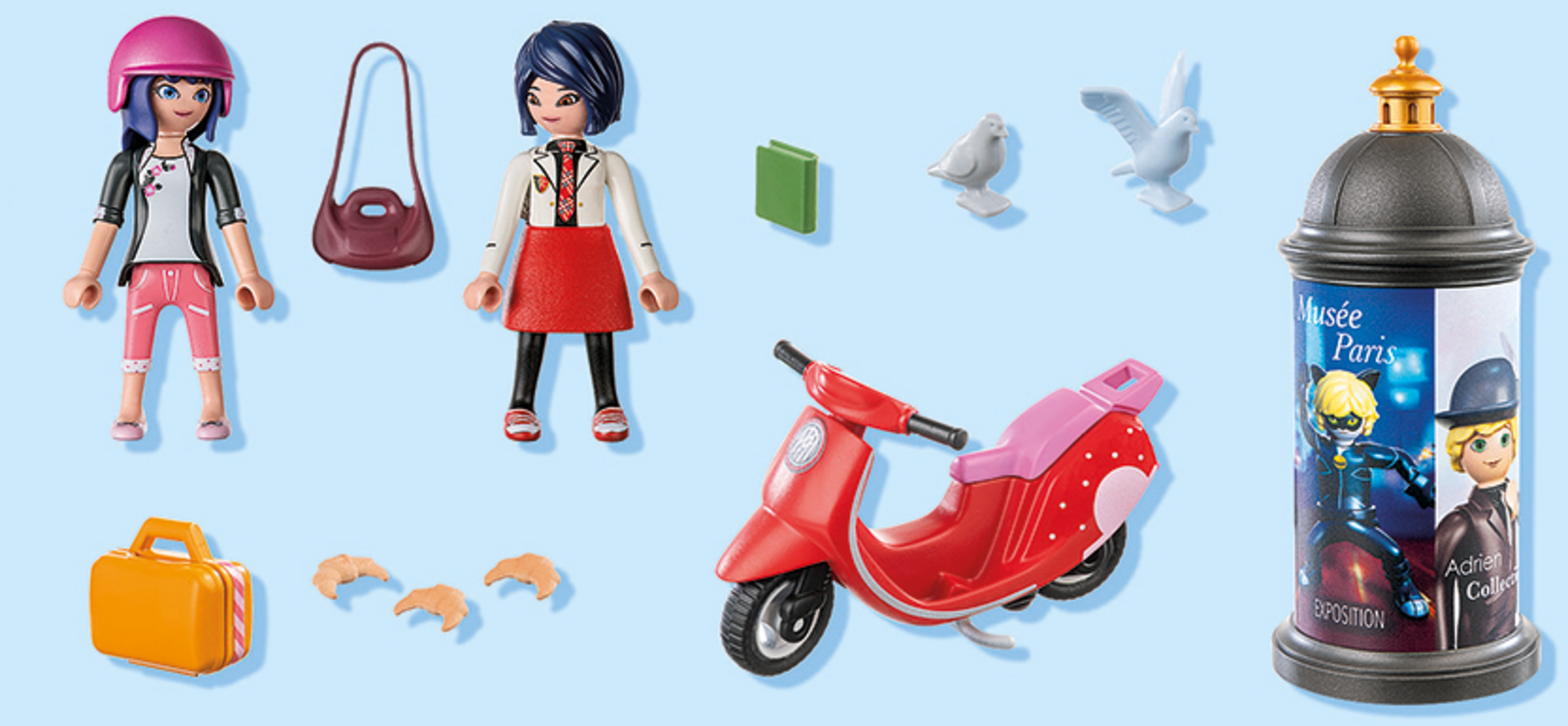 Innehåll: 2 tonåringar (Marinette Dupain-Cheng & Kagami Tsurugi), 2 duvor, 1 reklampelare, 1 skoter med korg, 1 hjälm, 3 croissanter, 1 axelväska, 1 bok