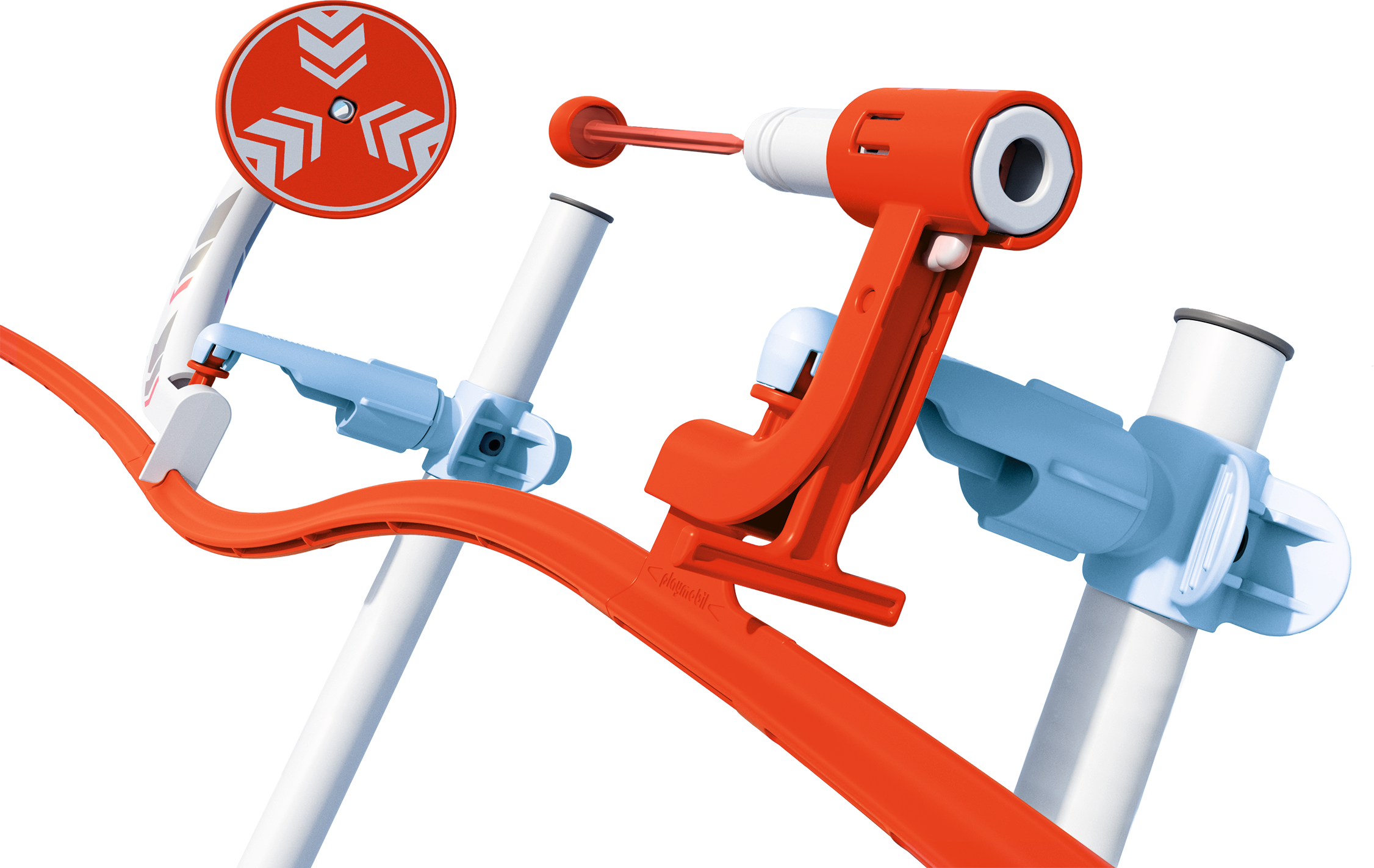 Detta Sky Trails-tillbehörsset garanterar nervpirrande spänning på höghastighetsbanan. Placera blockaden och bansprängaren strategiskt på din bana. När Sky Rider-figuren rusar förbi strålaren avfyras en pil automatiskt. Om den träffar blockaden är vägen fri. Om den missar är en kollision oundviklig.