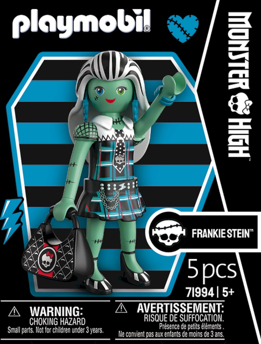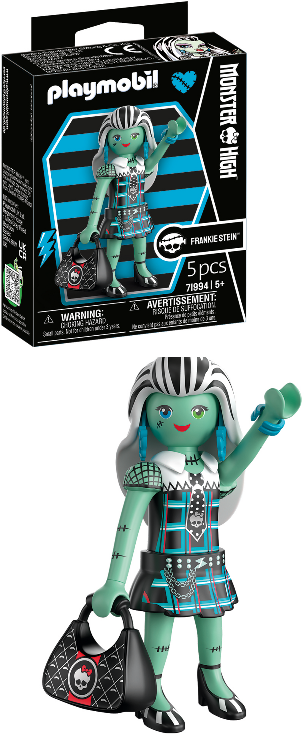 Redo för monstruöst skoj? Frankie Stein, den energiska eleven från Monster High™, finns nu tillgänglig som en mycket detaljerad PLAYMOBIL-figur. Hennes distinkta lapptäcksstil fångas perfekt och kombineras med klassisk PLAYMOBIL-berlock. Som ett blixtsnabbt tillbehör kommer hon med sin ikoniska handväska i en cool bultdesign som perfekt framhäver hennes personlighet. Tack vare den beprövade modulära PLAYMOBIL-designen kan du posera Frankie på de coolaste sätten genom att röra eller byta ut hennes armar och ben.