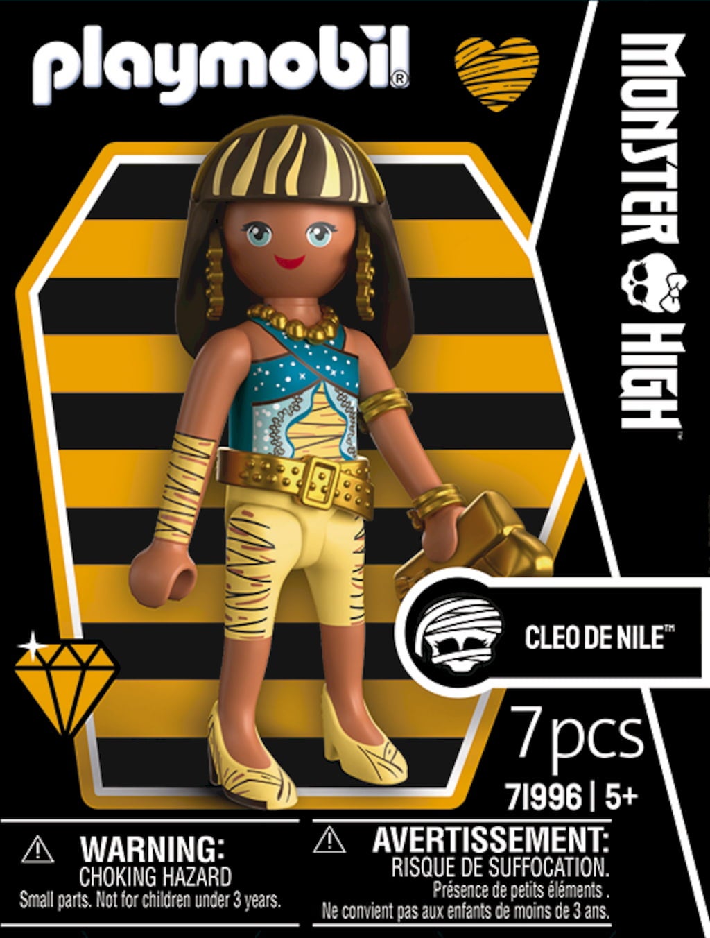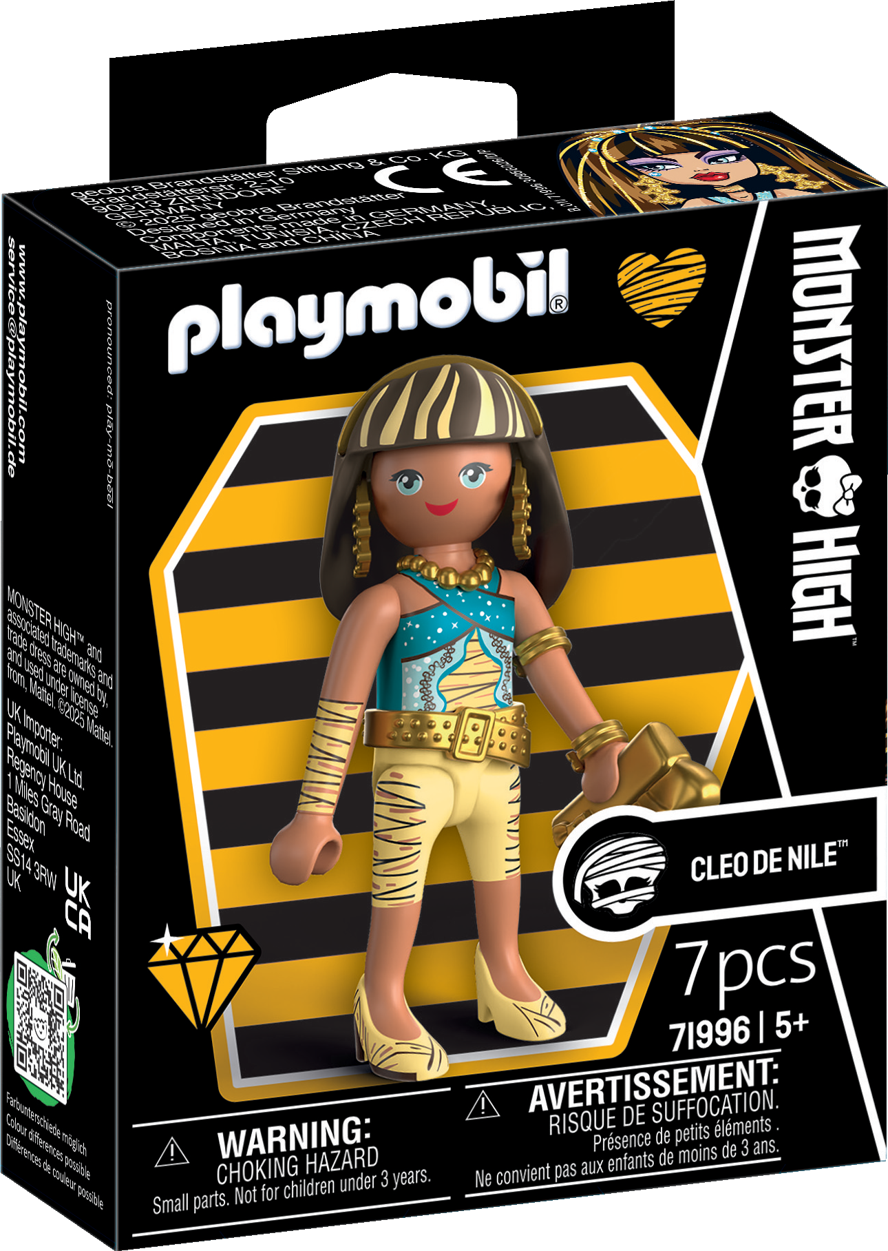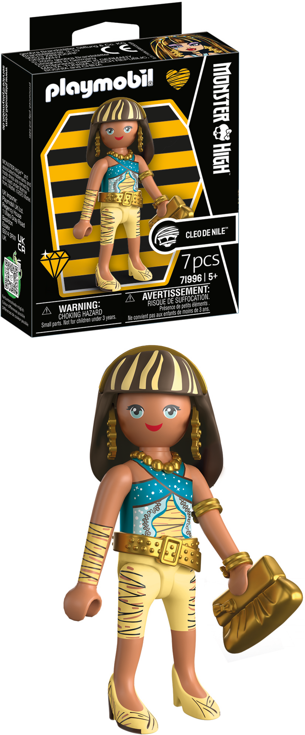 Här kommer Cleo De Nile, den obestridda drottningen av Monster High™, nu som en glamorös PLAYMOBIL-figur, redo att komma direkt till ditt hem. Hon imponerar med sin omisskännliga look, med kungliga skärp som är elegant avslutade med gulddetaljer. Hon är ett sant modeuttryck och bär en matchande, snygg handväska som perfekt kompletterar hennes look. Tack vare det beprövade modulära PLAYMOBIL-systemet kan du röra hennes armar och ben för att posera henne i dramatiska, kungliga positioner.