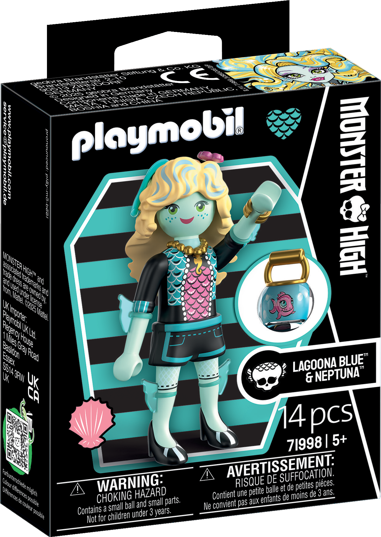 Dyk ner i Monster High™:s pulserande värld med denna minutiöst detaljerade PLAYMOBIL-figur, som verkar ha kommit direkt ur havets djup. Lagoona Blue fängslar med sin omisskännligt böljande silhuett och en elegans som kommer att ge en fräsch touch till vilken samling som helst. Som en speciell höjdpunkt kommer hon med sin ikoniska PLAYMOBIL-liknande transparenta väska, där hennes lojala lilla fiskvän tryggt kan sitta. Tack vare den beprövade modulära PLAYMOBIL-designen kan du omorganisera Lagoona om och om igen och iscensätta henne för fantasifulla äventyr. En riktig blickfångare på hyllan eller stjärnan i din lekvärld, denna figur ger äkta havsvibbar och är ett måste för alla fans.