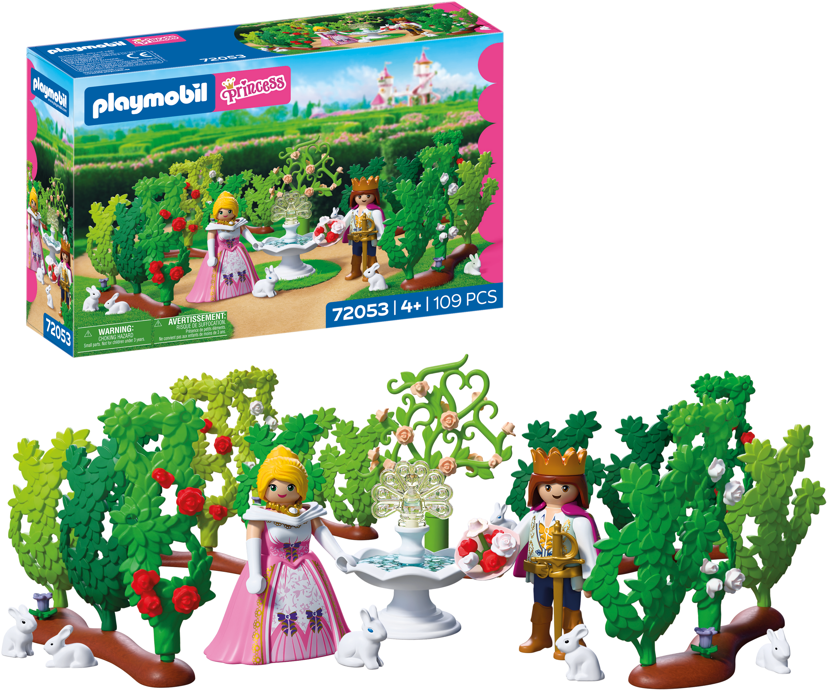 I PLAYMOBIL kunglig labyrint smyger prinsen genom slingrande häckar och doftande blommor för att överlämna en blomsterbukett till prinsessan. Söta kaniner visar vägen, medan rörliga häckar och rankor skapar nya stigar och hemliga hörn.