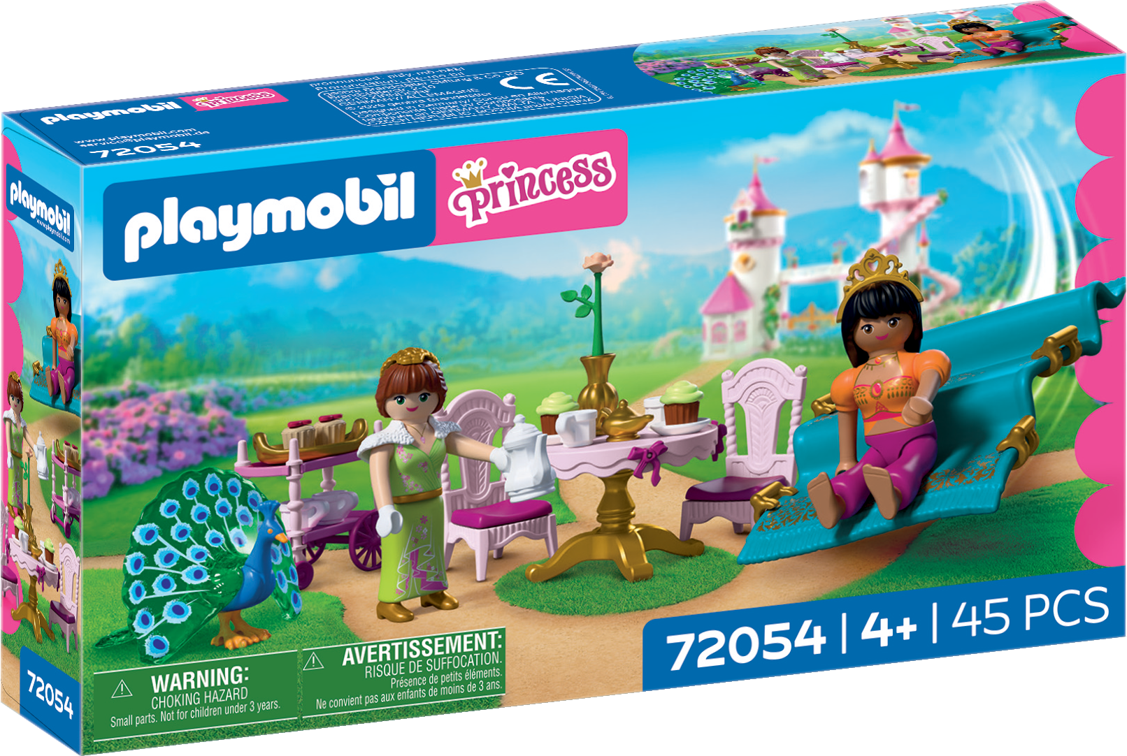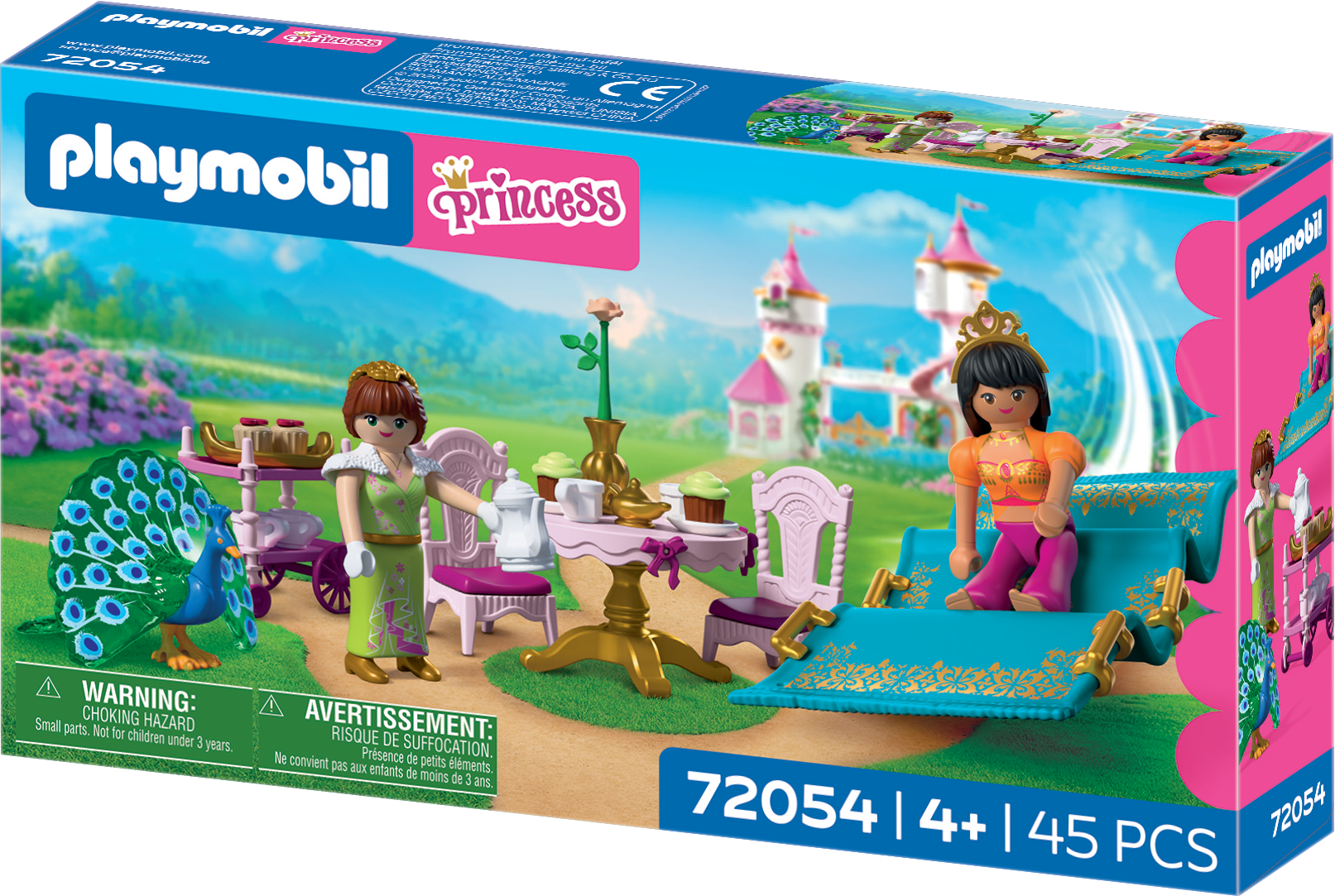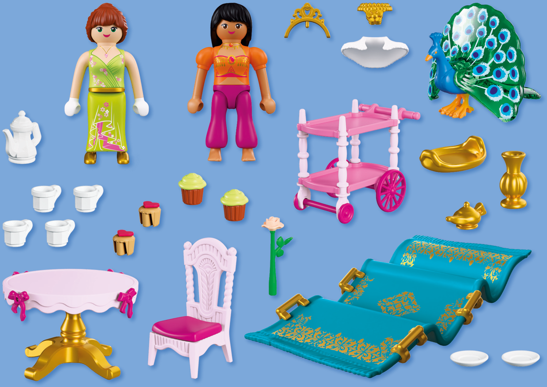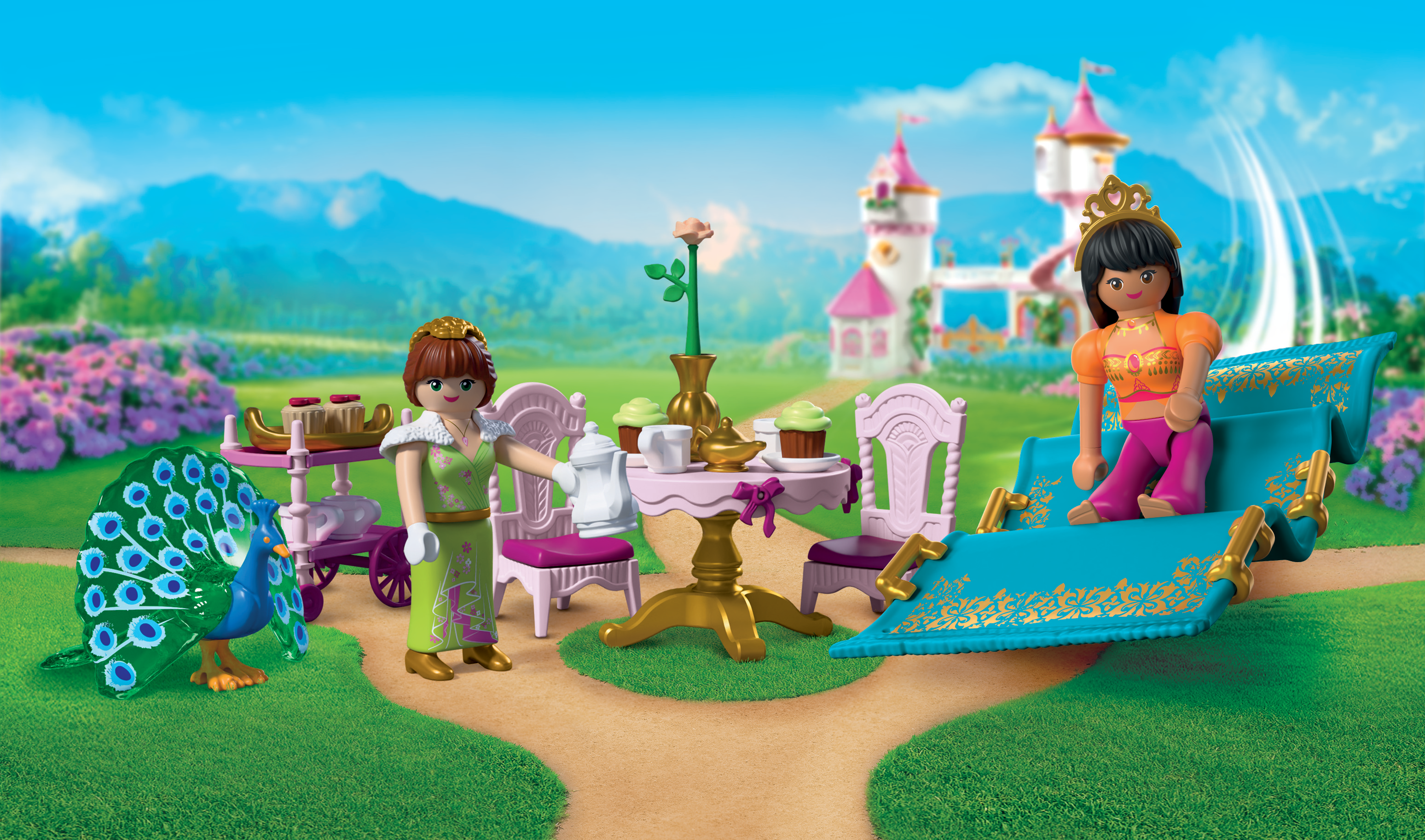 Prinsessan bjuder in sin vän till en mysig kaffestund i slottsparken. Resan dit sker spektakulärt på en flygande matta som möjliggör säkra starter och mjuka landningar. Med bord, stolar, serveringsvagn, cupcakes och en påfågel skapas en sagolik och avkopplande lekvärld.