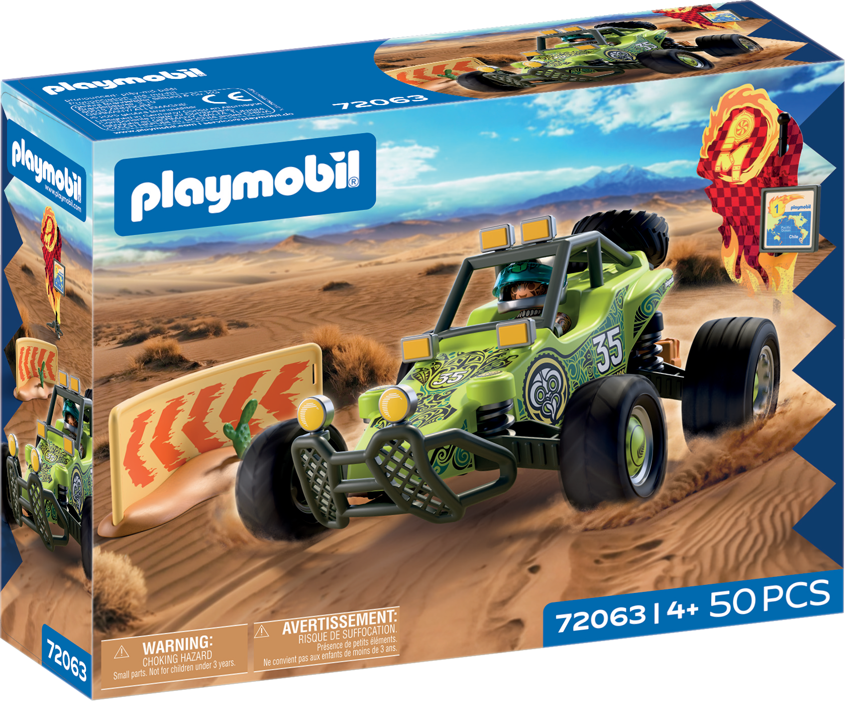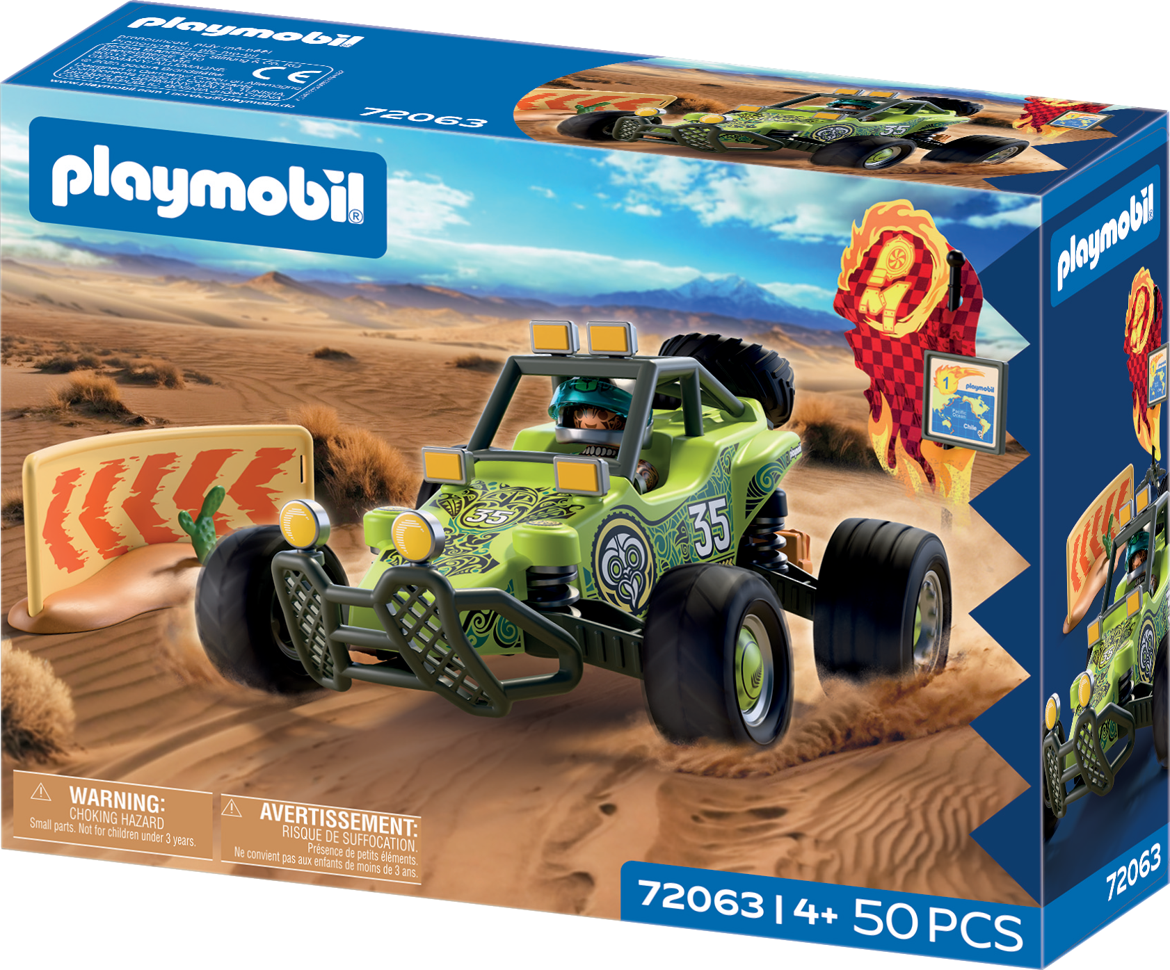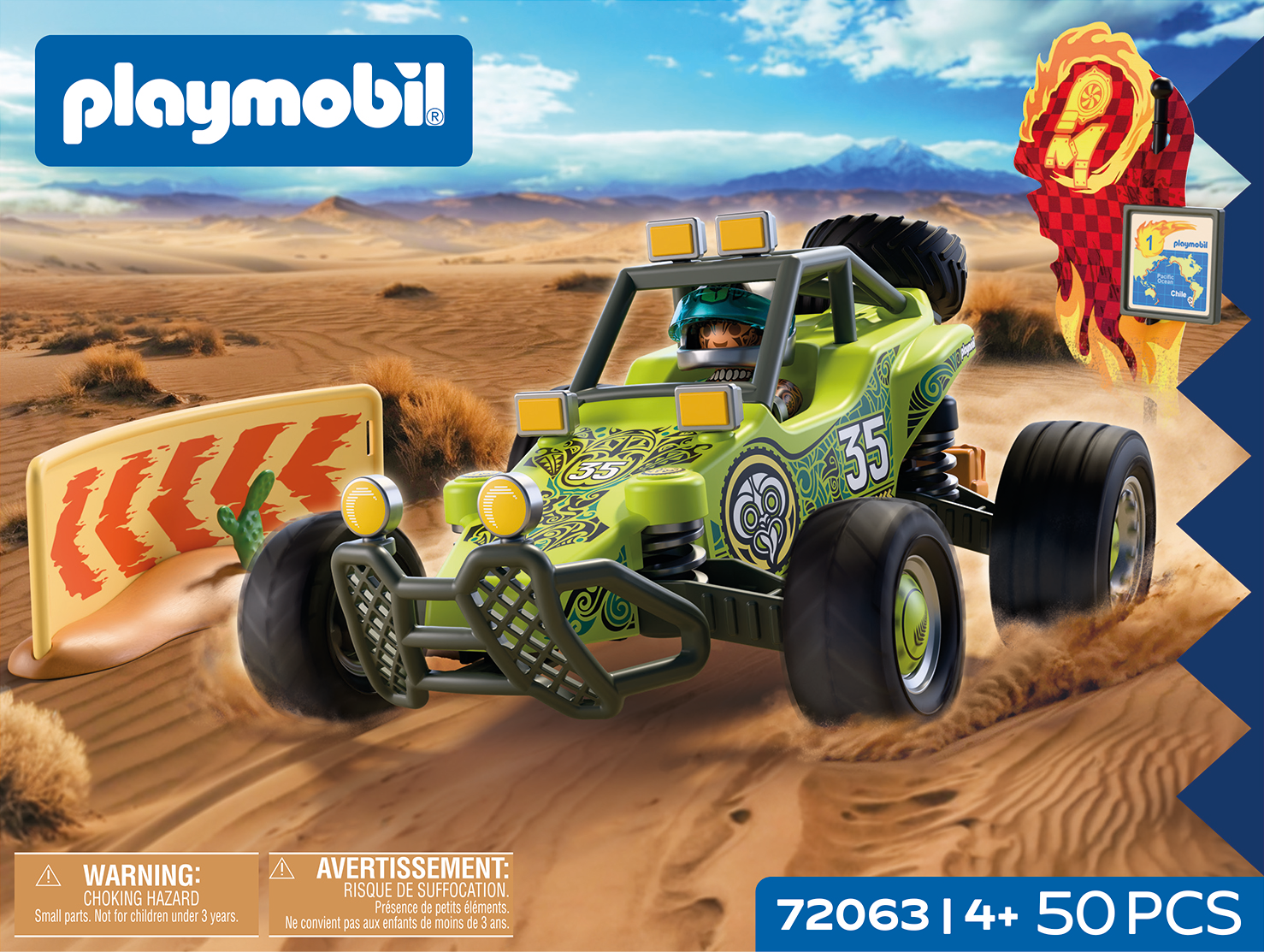 Med PLAYMOBIL offroad buggy kör små förare genom den heta ökenetappen av ”Ring of Fire”-loppet i Chile! Fjädrande bakaxlar, ett robust chassi och smart placerade fästen för reservhjul och verktyg gör varje lopp till ett riktigt äventyr.