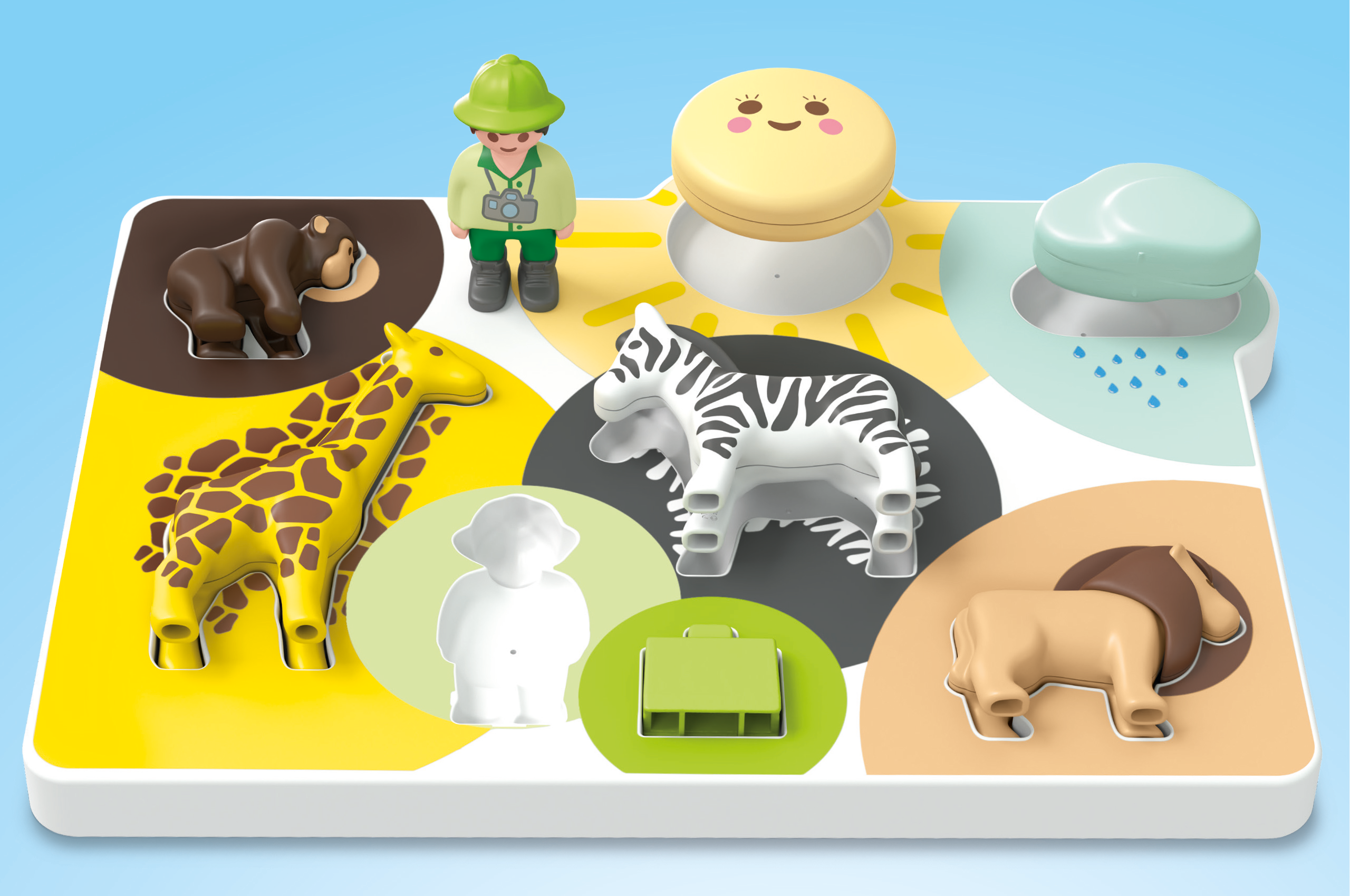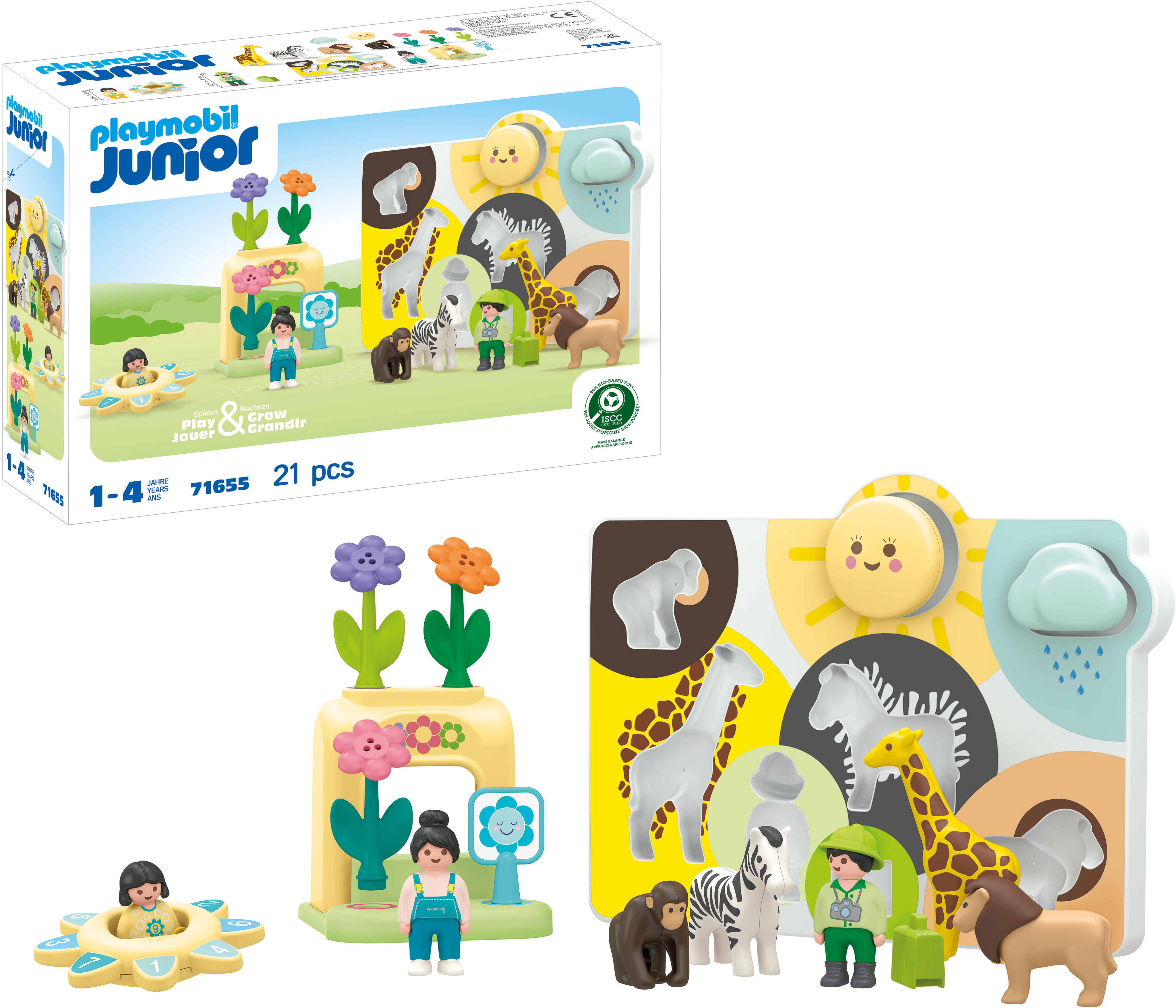 Innehåll: 1 kvinna, 1 man, 1 flicka, 1 giraff, 1 zebra, 1 lejon, 1 apa, 1 pusselbräda, 1 blomställning, 1 siffersnurra, 3 stapelbara blommor, 1 skylt, 1 moln, 1 sol, 1 resväska