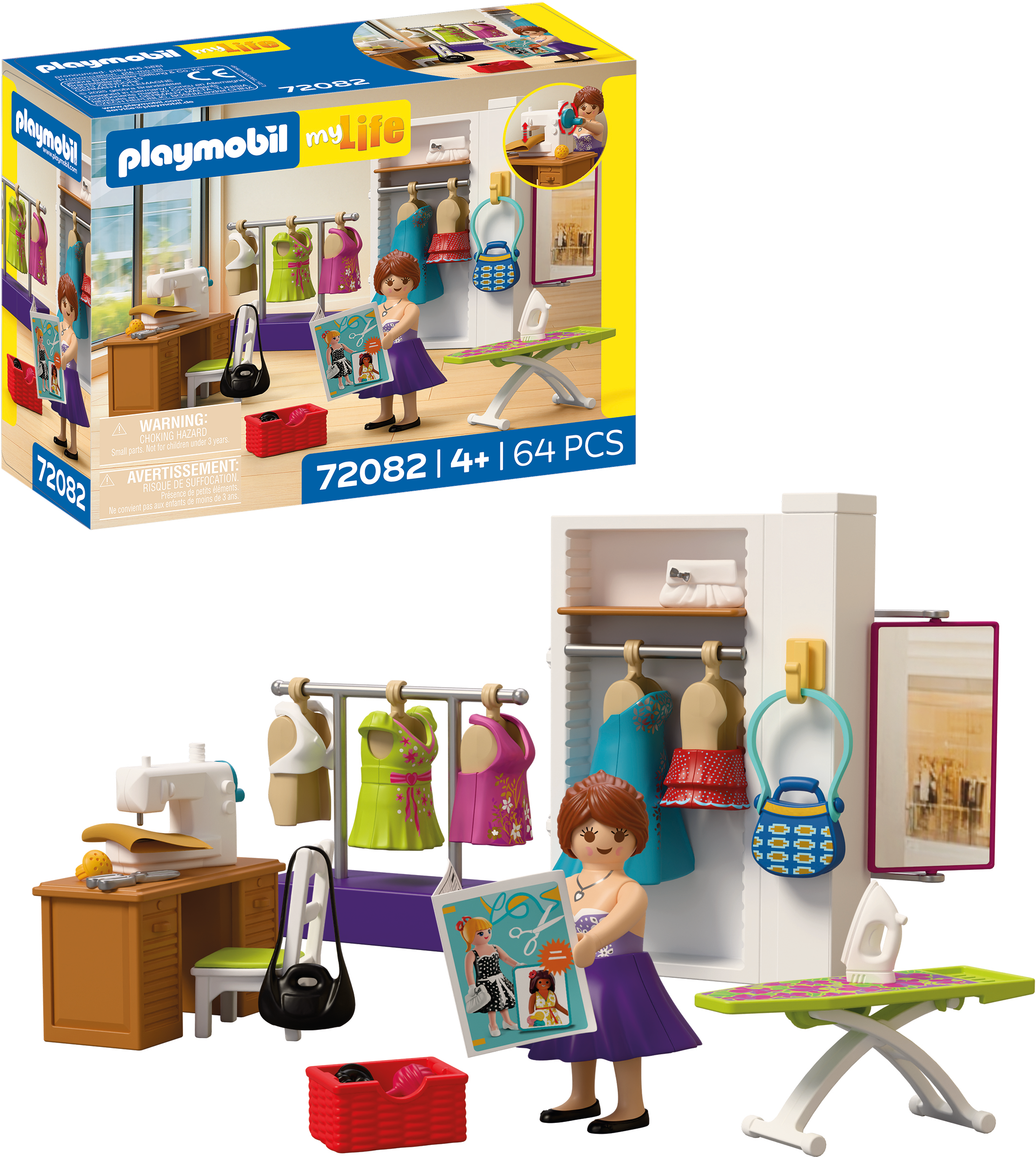 I sin egen syateljé skapar modedesignern nya kläder och förverkligar sina kreativa modeidéer. Med symaskin, klädställning, spegel och accessoarer kan klänningar sys, provas, strykas och presenteras. Detta detaljerade PLAYMOBIL-set inbjuder till fantasifull rollspel och erbjuder otaliga möjligheter att skapa nya stilar.
