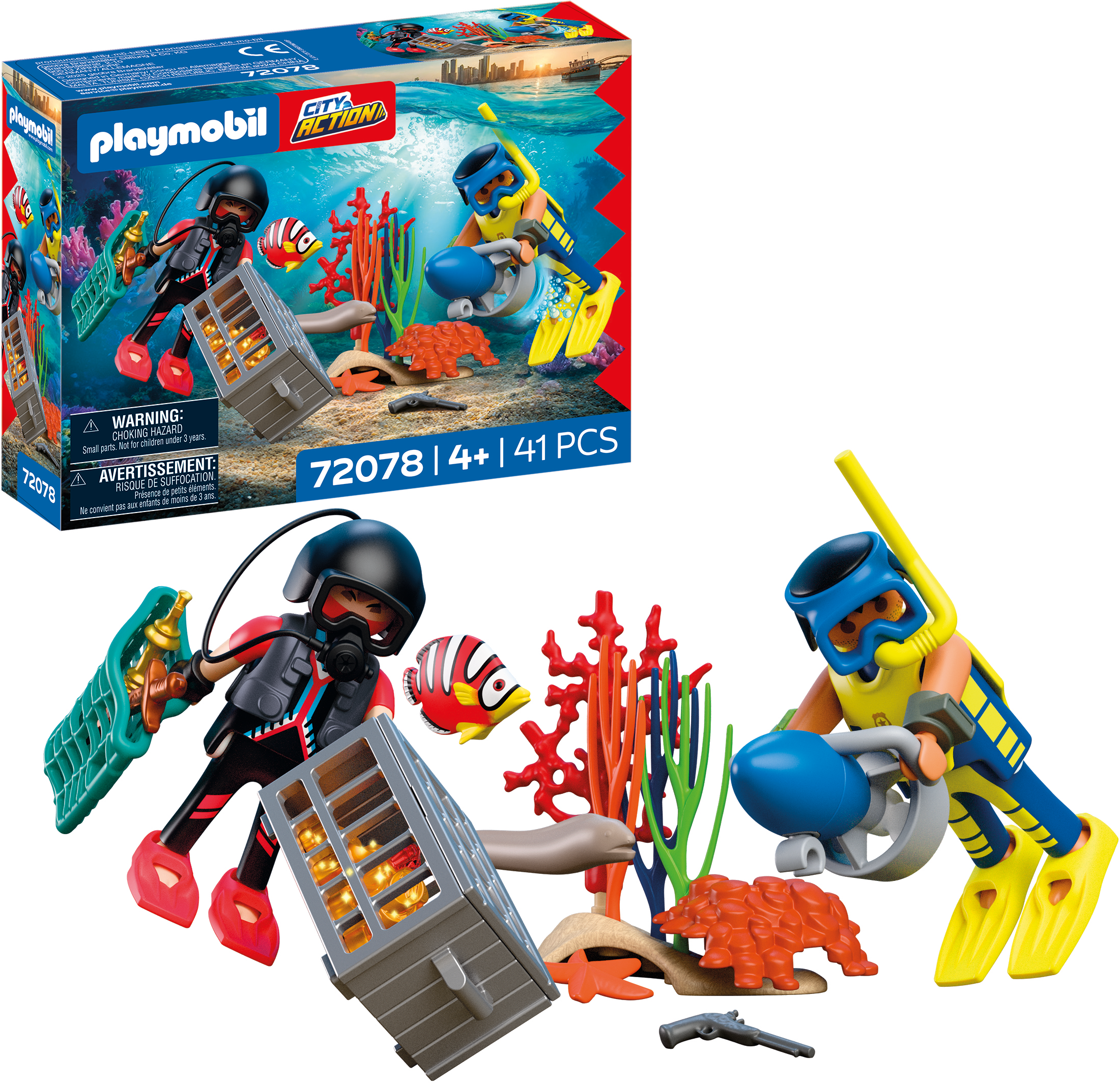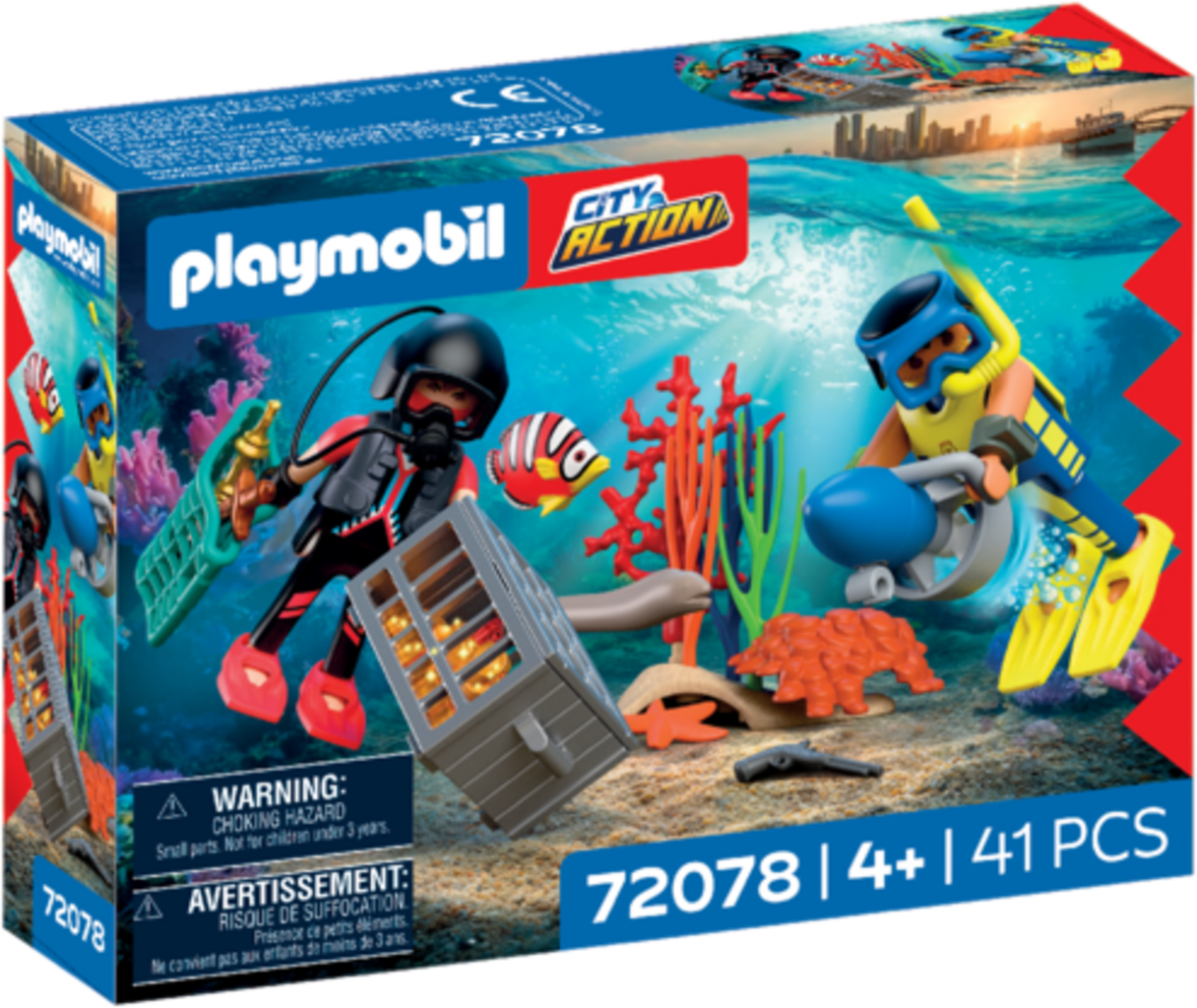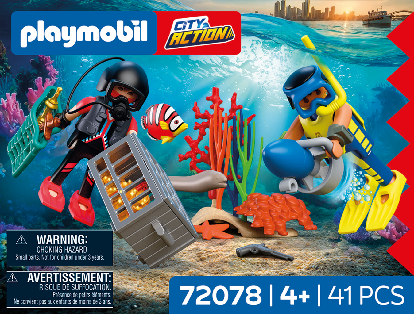 Polisdykaren jagar en tjuv som har gömt sin guldskatt och sina vapen under vattnet. Med dykhjälm, fenor och undervattensscooter kan han säkert hämta bytet och återskapa spännande undervattensuppdrag. Setet uppmuntrar till kreativt rollspel i djuphavet och erbjuder otaliga äventyrsmöjligheter.