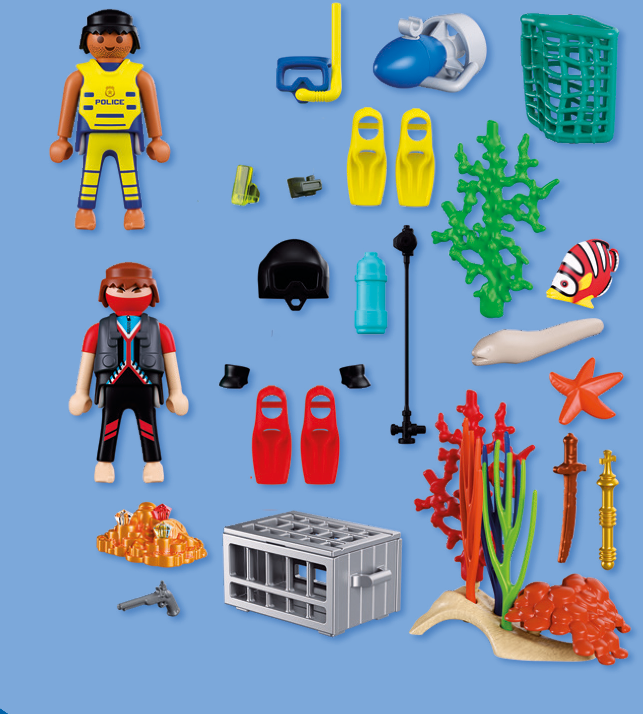 1 polisdykare, 1 dykare, undervattensscooter, skattkista, guldhög, juveler, piratsabel, pistol, spira, dykhjälm, syrgastank, 2 armskydd, 4 fenor, snorkelmask, minidator, nätkorg, 1 muräna, 1 sjöstjärna, 1 fjärilsfisk, 3 undervattensväxter, 1 svamp, 1 sanddyn, 1 grön korall, 1 röd korall, genomskinlig manschett.