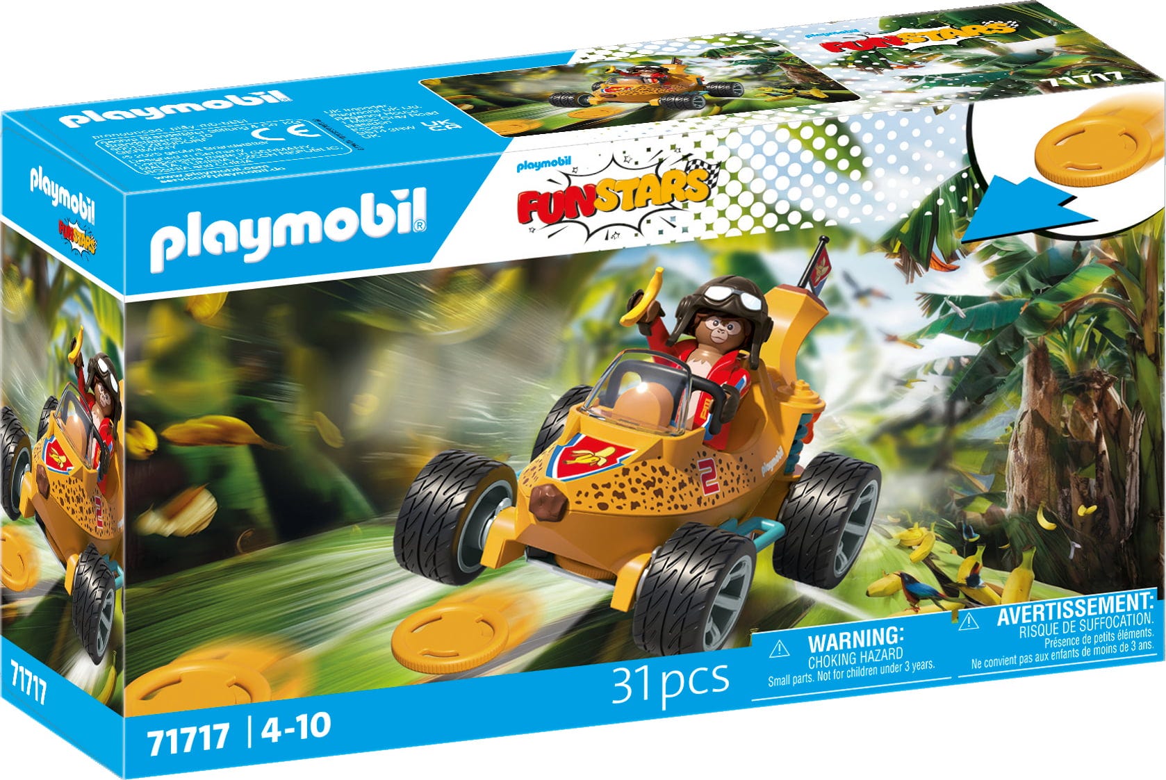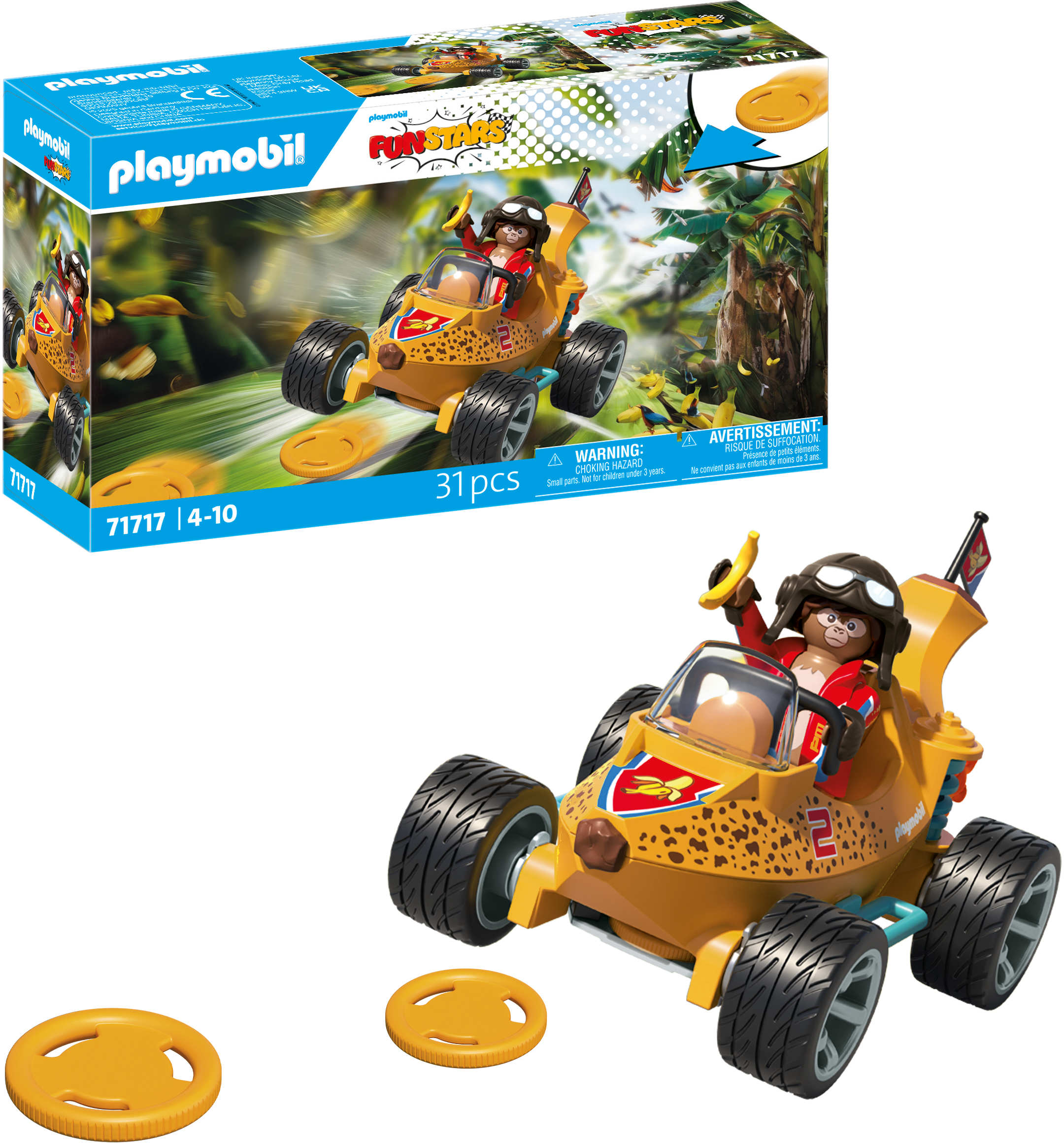Bananbilen kommer att ge spänning på vilken racerbana som helst! Med en skivskjutare, elddriven motor och en snygg apabil i cockpiten kan barn njuta av spännande lopp och fantasifulla äventyr. Hjälm, handskar och flagga kompletterar detta roliga set – action, kul och kreativitet garanteras!